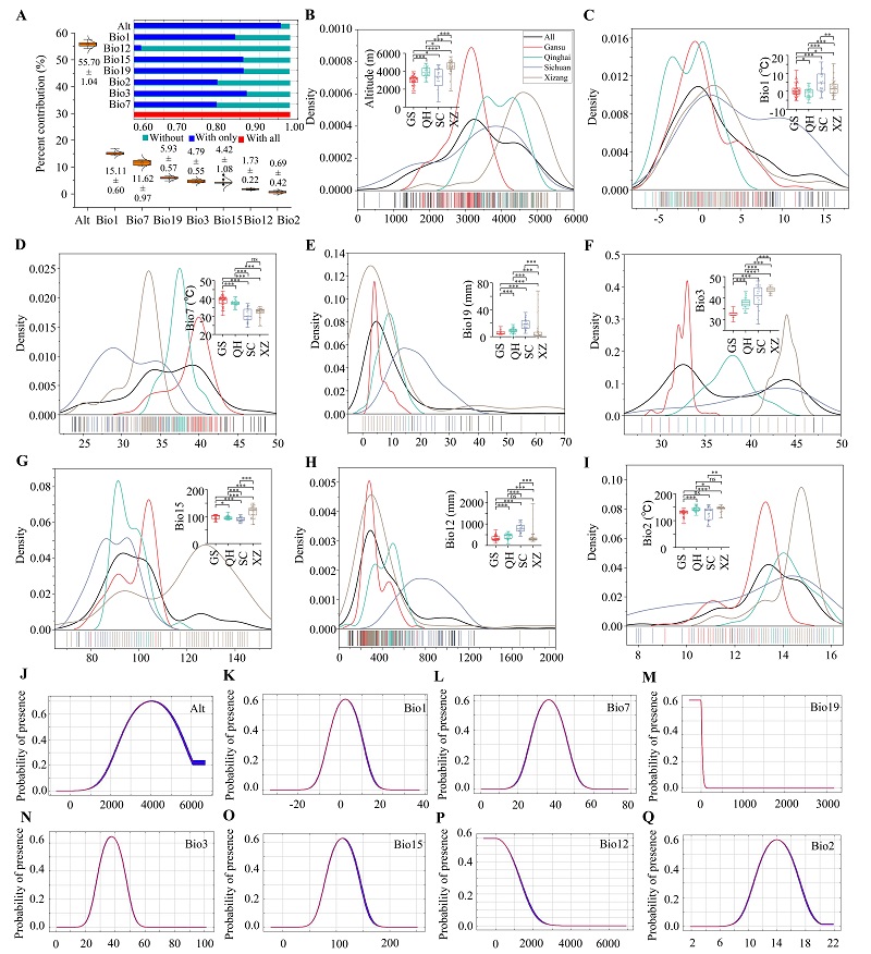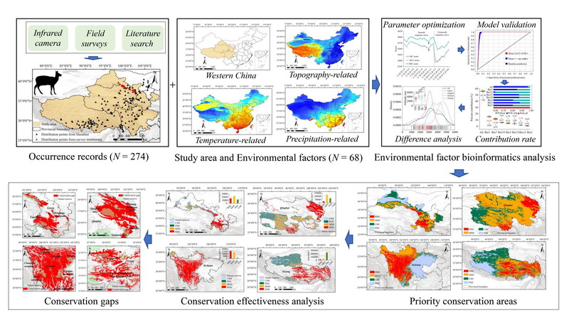 全球生物多樣性面臨嚴重威脅,瀕危物種的保護已成為當前生物多樣性保護領域最為緊迫的任務之一。棲息地保護是瀕危物種保護的核心任務之一,通過建立適宜性模型評估物種棲息地的空間分布現(xiàn)狀,能夠有效評估自然保護區(qū)現(xiàn)有保護成效并識別瀕危物種潛在的保護空缺。青藏高原是全球重要的生物多樣性熱點地區(qū),馬麝是該區(qū)域特有的瀕危物種,因受到棲息地破碎和非法捕獵等的多重威脅,種群數(shù)量顯著下降,該物種的保護與種群的恢復已刻不容緩,面臨著一系列嚴峻的挑戰(zhàn)。本研究選取馬麝作為研究主體,應用棲息地適宜性評估方法,探討瀕危物種在自然保護區(qū)的保護成效并識別保護空缺,旨在為瀕危物種的棲息地保護和種群恢復提供更加精準的策略和實踐指導,確保這些珍稀瀕危物種能夠得到有效維護與可持續(xù)發(fā)展。