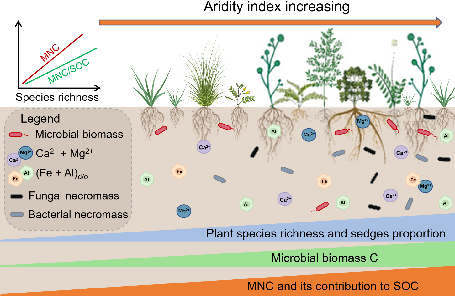 研究表明,隨著干旱指數(shù)的增加(濕度增加),植物種多樣性、植物生物量以及莎草科(Cyperaceae)在地上生物量中的比例顯著增加。同時(shí),MNC含量及其對SOC的貢獻(xiàn)也隨干旱指數(shù)的增加而增加。結(jié)構(gòu)方程模型及偏相關(guān)分析表明,植物種多樣性在促進(jìn)土壤MNC積累和SOC固存中起關(guān)鍵作用,植物多樣性的提升顯著增加了莎草科植物的豐度,增加了根系生物量和根際沉積,進(jìn)而促進(jìn)了MNC的積累。