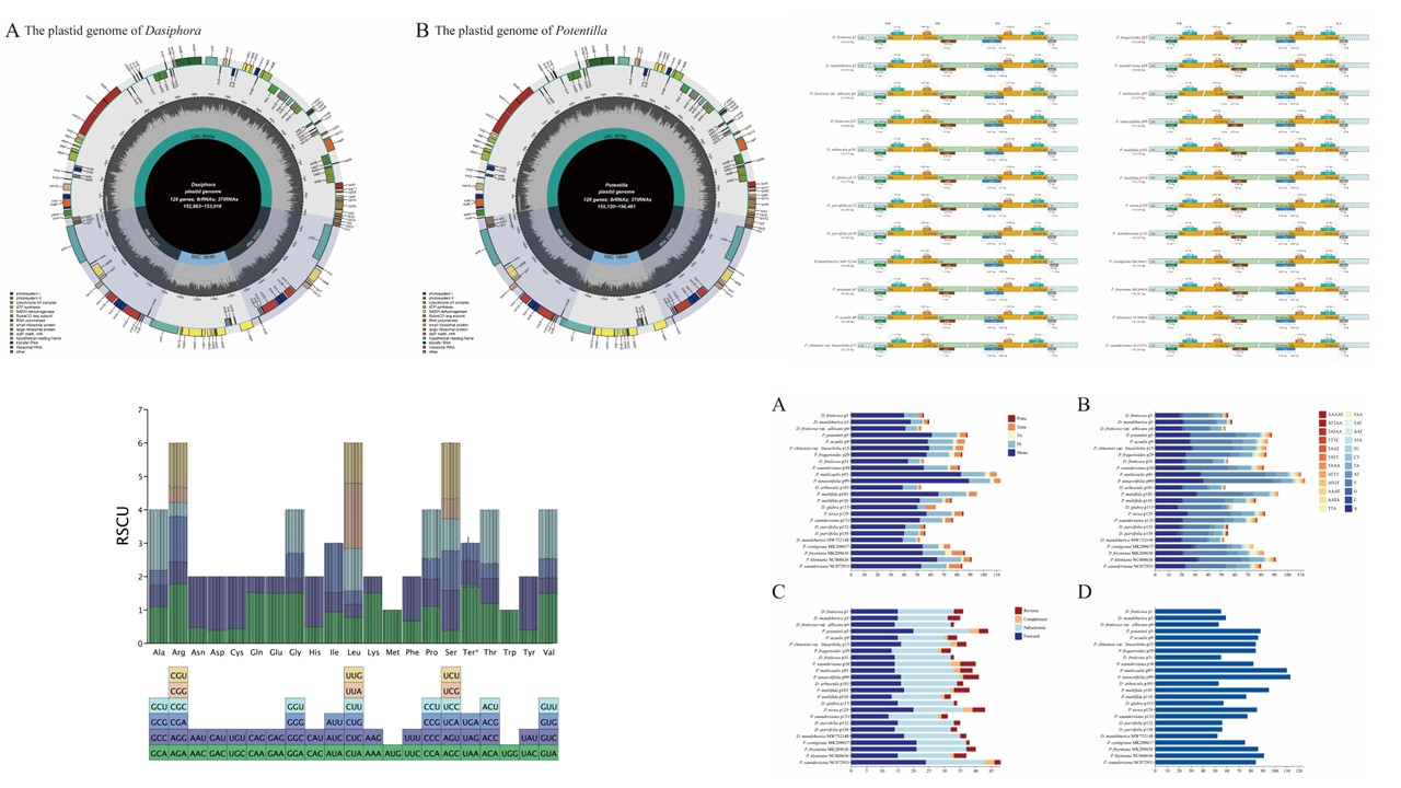 研究結(jié)果以“Comparative and phylogenetic analysis of Potentilla and Dasiphora (Rosaceae) based on plastid genome”為題,于2025年2月10日在BMC Plant Biology(中國(guó)科學(xué)院二區(qū)Top,IF=4.3)發(fā)表。西北高原所碩士研究生李孝平為第一作者,西北高原所張發(fā)起研究員為通訊作者。該工作得到了第二次青藏高原綜合科學(xué)考察研究、青海省重大科技專項(xiàng)、中國(guó)科學(xué)院戰(zhàn)略生物資源計(jì)劃、中國(guó)科學(xué)院-青海省三江源國(guó)家公園聯(lián)合研究專項(xiàng)和中國(guó)科學(xué)院“西部之光”人才培養(yǎng)計(jì)劃等項(xiàng)目資助。