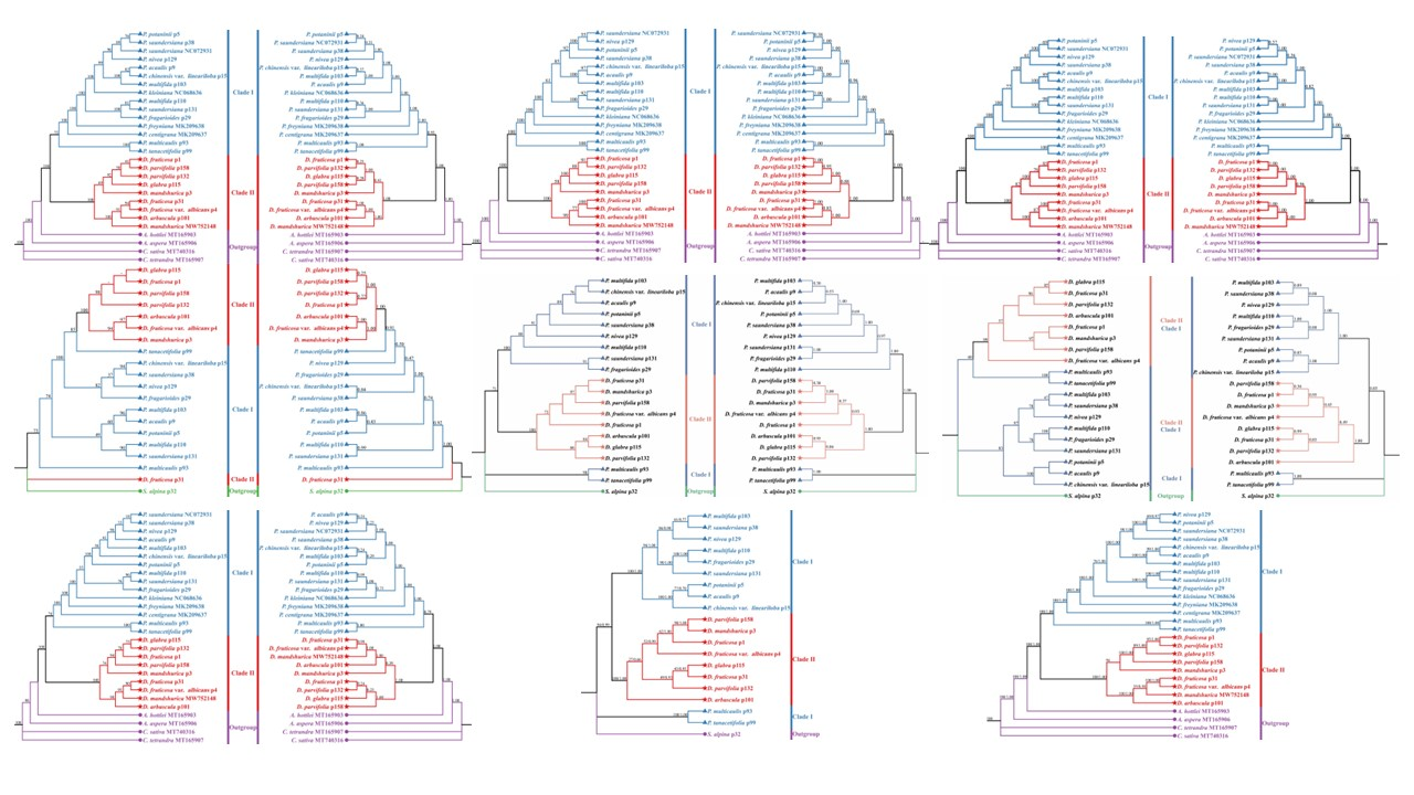 中國(guó)科學(xué)院西北高原生物研究所青藏高原植物適應(yīng)與進(jìn)化研究團(tuán)隊(duì)選擇了19個(gè)委陵菜屬和金露梅屬的全質(zhì)體基因組進(jìn)行Illumina二代測(cè)序,重建了該類群的系統(tǒng)發(fā)育關(guān)系,并研究了他們之間的核質(zhì)沖突關(guān)系。研究結(jié)果表明,這些質(zhì)體基因組的結(jié)構(gòu)、GC含量和基因組成都高度保守,包含84個(gè)CDS、37個(gè)tRNA基因和8個(gè)rRNA基因。此外,所有金露梅屬質(zhì)體基因組的rpl2失去了唯一的內(nèi)含子。比較基因組分析結(jié)果表明,質(zhì)體大小的差異歸因于LSC區(qū)、SSC區(qū)和IRS區(qū)的長(zhǎng)度差異,并且IR區(qū)大部分是保守的,非編碼區(qū)比編碼區(qū)具有更高的差異性。我們篩選了SSR,發(fā)現(xiàn)了7個(gè)高度可變位點(diǎn),可作為潛在的分子標(biāo)記,在闡明委陵菜屬和金露梅屬的屬間關(guān)系上具有一定的參考意義。通過(guò)核基因(ITS、ETS)和細(xì)胞質(zhì)基因(質(zhì)體、線粒體)構(gòu)建的系統(tǒng)發(fā)育樹,確定了委陵菜屬和金露梅屬的單系性。我們?cè)谖瓴藢僦袡z測(cè)到了核質(zhì)沖突,這種沖突往往會(huì)導(dǎo)致其單系性發(fā)生變化,我們推測(cè)可能在其進(jìn)化過(guò)程中發(fā)生了一定程度的種間雜交或不完整譜系分選事件。本研究通過(guò)對(duì)委陵菜屬和金露梅屬的系統(tǒng)發(fā)育比較分析,為該類群之間的分類學(xué)研究奠定基礎(chǔ)。