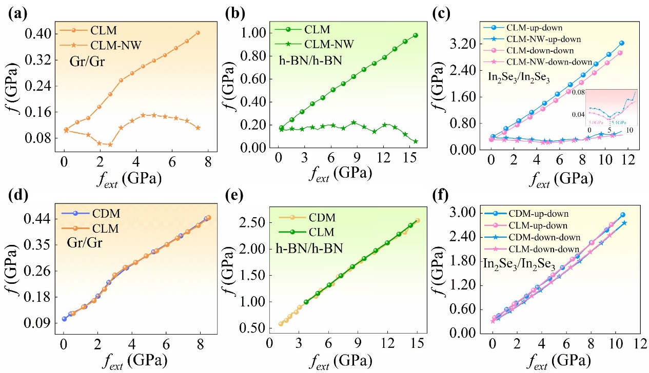 近日,中國(guó)科學(xué)院蘭州化學(xué)物理研究所潤(rùn)滑材料全國(guó)重點(diǎn)實(shí)驗(yàn)室計(jì)算摩擦學(xué)課題組與蘭州交通大學(xué)材料科學(xué)與工程學(xué)院等單位合作,使用自主搭建的固體界面摩擦性能第一性原理高通量計(jì)算平臺(tái)LICP-FPHTC-Platform ( 摩擦學(xué)學(xué)報(bào)42(2022)493;軟件著作權(quán)2021SR1172689),考慮目前主流的三種靜態(tài)摩擦性能計(jì)算模型——等距模型(CDM)、等載模型(CLM)、無(wú)負(fù)載做功的等載模型(CLM-NW),針對(duì)已報(bào)道了負(fù)摩擦系數(shù)的二維材料界面體系——Gr/Gr、h-BN/h-BN、In2Se3/In2Se3,研究了摩擦性能的計(jì)算結(jié)果對(duì)計(jì)算模型的依賴。結(jié)果表明,只有CLM-NW的計(jì)算模型出現(xiàn)了文獻(xiàn)報(bào)道的負(fù)摩擦系數(shù)現(xiàn)象,CDM和CLM的摩擦計(jì)算結(jié)果定量一致(圖1)。