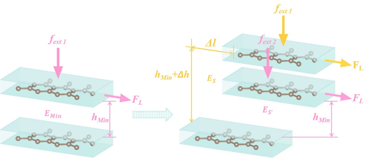 圖2 等載和等距滑動(dòng)過(guò)程中界面受力示意圖。滑動(dòng)過(guò)程中的能量最小點(diǎn)(左)和鞍點(diǎn)(右)。黃色和粉色標(biāo)記分別表示等載和等距滑動(dòng)過(guò)程的界面信息