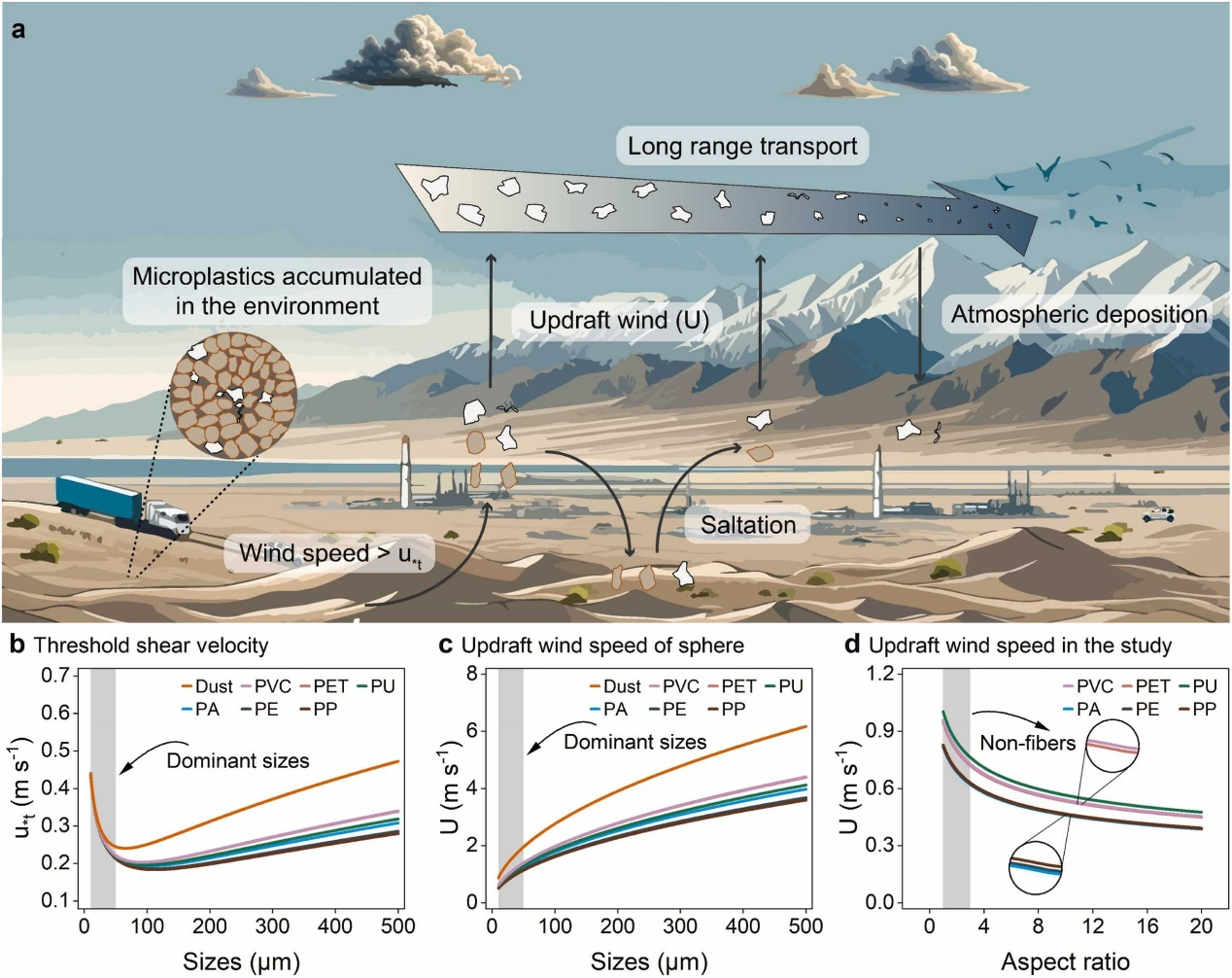 研究團(tuán)隊(duì)通過對祁連山地區(qū)的總懸浮顆粒物進(jìn)行系統(tǒng)采樣,探究了該地區(qū)的大氣微塑料污染,并使用拉格朗日粒子擴(kuò)散模型探索了大氣微塑料的潛在源區(qū)。結(jié)果顯示,大氣微塑料數(shù)量濃度為4.07±2.37 個 m-3,在春季最高;大氣微塑料質(zhì)量濃度為0.126±0.152 μg m-3,在冬季最大。微塑料主要聚合物類型為PA、PE、PET、PP、PU和PVC,微塑料數(shù)量集中在小于50微米的尺寸,形狀以碎片為主。局地人類活動對大氣中微塑料濃度的影響有限,潛在源區(qū)的粉塵排放顯著影響大氣微塑料濃度。粉塵和微塑料的相似閾值剪切速度表明它們在潛在源區(qū)的沙塵事件期間共同排放。一旦微塑料被夾帶到氣流中,微塑料懸浮所需較低的上升風(fēng)速會促進(jìn)微塑料長距離大氣傳輸。