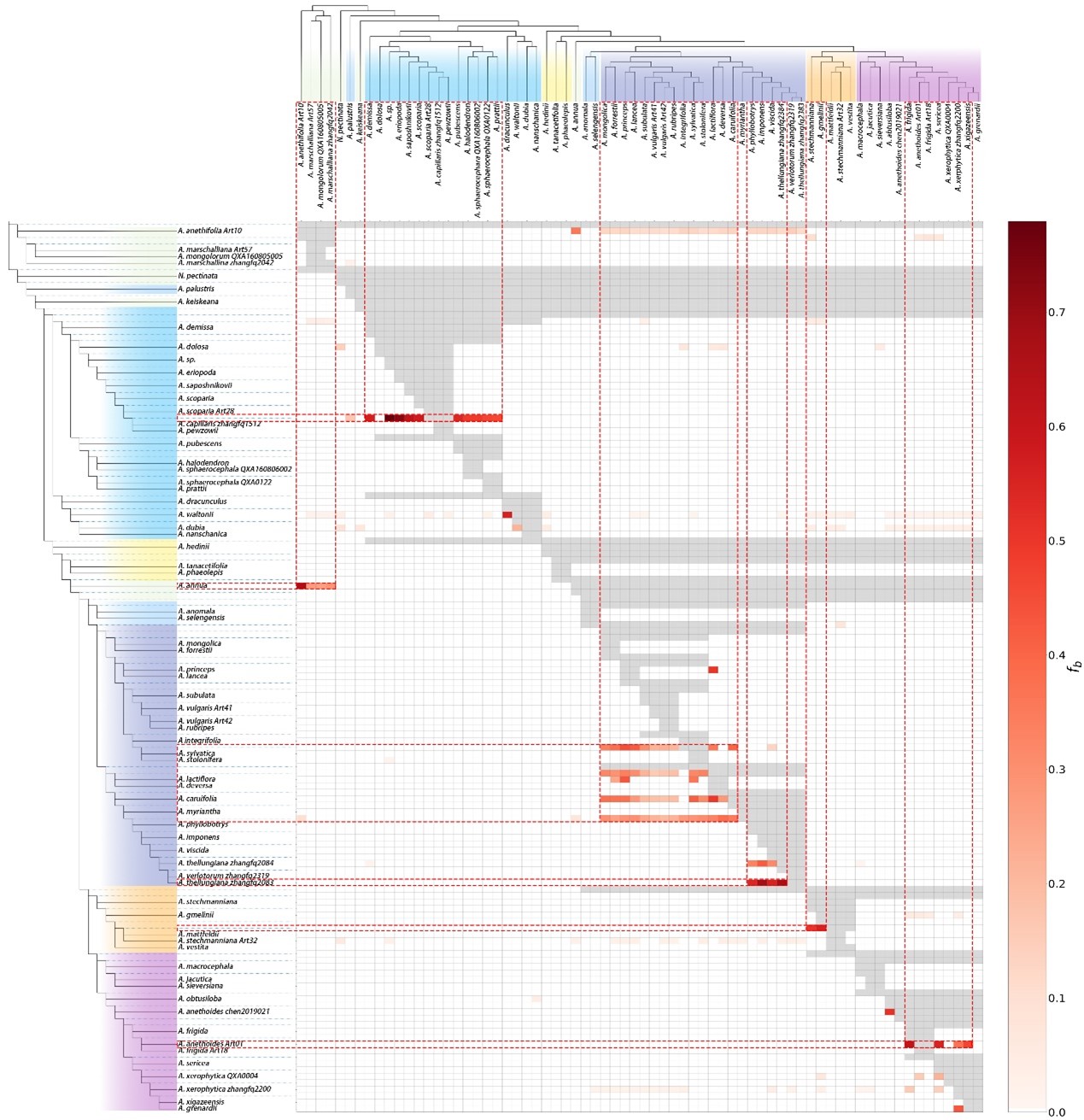 中國(guó)科學(xué)院西北高原生物研究所青藏高原植物適應(yīng)與進(jìn)化研究團(tuán)隊(duì)選擇東亞蒿屬及其近緣類群共94個(gè)物種進(jìn)行Illumina二代測(cè)序,利用質(zhì)體基因組、SNP數(shù)據(jù)和nrDNA重建了該類群的系統(tǒng)發(fā)育關(guān)系,并推測(cè)其生物歷史地理。研究結(jié)果表明,質(zhì)體捕獲、雜交、漸滲等事件導(dǎo)致了蒿屬及其屬下亞屬的強(qiáng)烈核質(zhì)沖突,現(xiàn)有的蒿屬下分類方法無(wú)法將大多數(shù)亞屬劃分為單系。東亞蒿屬為漸新世早期就地起源,氣候震蕩和高原隆升促進(jìn)了該類群的多樣化發(fā)展。黑蒿(A. palustris)、櫛葉蒿(A. pectinata)、庵閭(A. keiskeana)和臭蒿(A. hedinii)可能是東亞區(qū)域現(xiàn)代蒿屬下主要譜系的早期分化類群。本研究揭示了東亞蒿屬及其亞屬?gòu)?fù)雜的系統(tǒng)發(fā)育關(guān)系和進(jìn)化歷史,為蒿屬植物的演化提供了新的見(jiàn)解。
