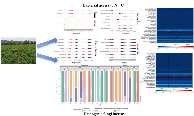 中國(guó)科學(xué)院西北高原生物研究所高原藥用資源生態(tài)保護(hù)與繁育研究團(tuán)隊(duì)以山莨菪為研究對(duì)象,基于微生物組和不同磷肥添加水平下生物堿含量的靶向測(cè)定,分析了磷肥添加對(duì)山莨菪生物堿含量的影響,揭示了土壤-微生物-植物相互作用的新機(jī)制。研究表明:磷肥通過(guò)雙重途徑對(duì)生物堿含量產(chǎn)生影響。一方面,土壤氮磷比例失調(diào)打破了土壤微生物氮循環(huán)的平衡,促使更多的細(xì)菌通過(guò)硝化-反硝化等過(guò)程獲得氮源和碳源,體現(xiàn)了磷肥添加下生物堿合成所需的氮源和能量的缺乏,干擾了植物次生代謝的資源分配;另一方面,磷肥添加重構(gòu)了微生物群落的功能布局,表現(xiàn)為低磷環(huán)境下菌根共生系統(tǒng)對(duì)碳、氮、磷的協(xié)同代謝增強(qiáng),而高磷環(huán)境下病原真菌大量繁殖阻礙了生物堿在植物體內(nèi)的合成和積累。這種微生物功能群落的生態(tài)位分化表明土壤養(yǎng)分?jǐn)_動(dòng)會(huì)改變微生物代謝網(wǎng)絡(luò),進(jìn)而調(diào)控藥用植物的次生代謝,為分析人工栽培中土壤管理、微生物功能和藥材質(zhì)量之間的耦合關(guān)系提供了理論依據(jù),明確了養(yǎng)分-微生物-代謝的級(jí)聯(lián)調(diào)控效應(yīng),為山莨菪的高效利用和價(jià)值提升提供了新見(jiàn)解。未來(lái)的研究應(yīng)重點(diǎn)關(guān)注基于微生物功能調(diào)控的精準(zhǔn)施肥策略,以實(shí)現(xiàn)藥用植物栽培中產(chǎn)量和品質(zhì)的協(xié)同提升。