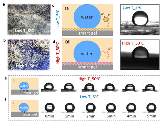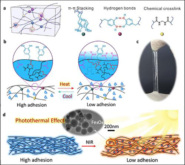 研究人員進一步揭示了其作用機制,通過近紅外光激發(fā)納米顆粒產生熱效應,誘導水凝膠發(fā)生溫度響應性相變,實現軟物質表面水分子的滲出/吸收,改變其表面親水羧酸基團的分子構象,進而可逆地控制鄰苯二酚基團的屏蔽和暴露。這種基于界面分子構象變化調控的黏附機制具有無殘留、可重復使用的特點,為智能黏附材料的開發(fā)提供了新思路。