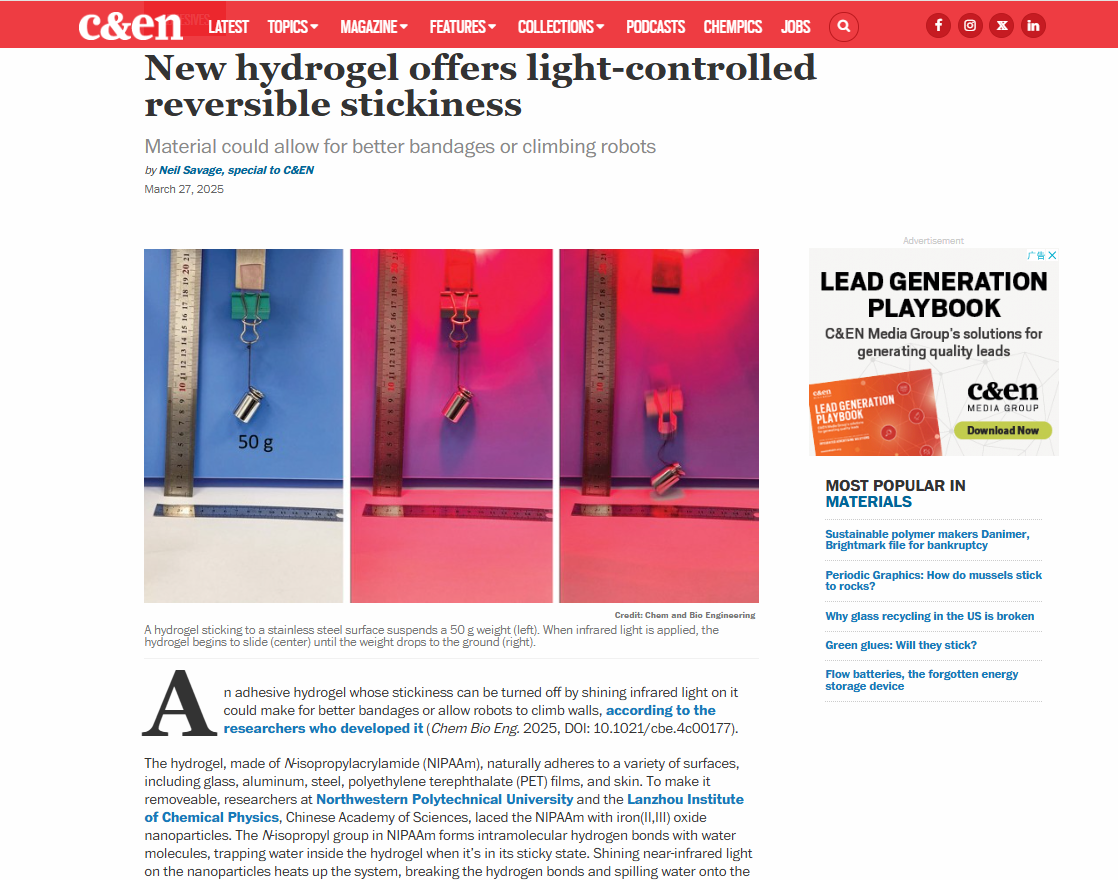 相關研究成果以“Light-controlled Adhesive Hydrogels for On-Demand Adhesion”為題發(fā)表在Chem & Bio Engineering上。同時,該成果已被美國化學學會發(fā)行的新聞周刊chemical?&?engineering?news(C&EN,全球最具權威和影響力的化學新聞來源之一。)以“New?hydrogel?offers?light-controlled?reversible?stickiness”為題報道。