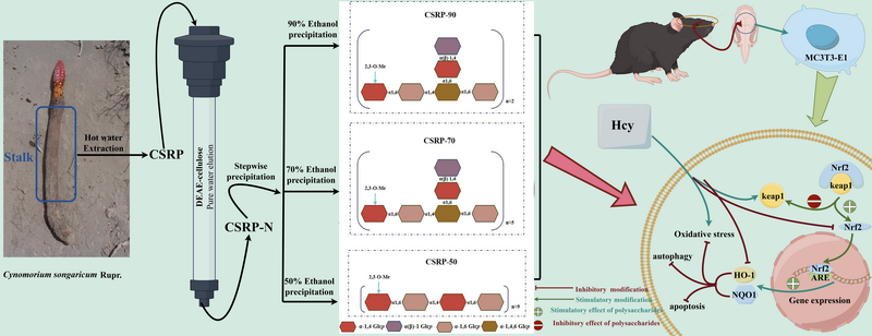 為了解決鎖陽資源利用中存在的上述科學(xué)問題,中國科學(xué)院西北高原生物研究所青海省藏藥藥理學(xué)和安全性評價研究重點(diǎn)實(shí)驗(yàn)室團(tuán)隊(duì),采用熱水提取、乙醇沉淀分級及柱層析純化相結(jié)合的方法,從鎖陽中得到3個多糖組分:CSRP-50、CSRP-70和CSRP-90,隨后對其組成、結(jié)構(gòu)、Hcy誘導(dǎo)成骨細(xì)胞氧化損傷保護(hù)作用進(jìn)行研究。組成結(jié)構(gòu)研究結(jié)果表明,3個多糖組分均為天然甲基化的α-(1→4),(1→6)-D-葡聚糖,其主鏈由α-1,4-D-Glcp和α-1,6-D-Glcp交替構(gòu)成。其中,CSRP-50無支鏈結(jié)構(gòu),CSRP-70和CSRP-90存在由α-1,6-D-Glcp和末端1位連接的α(β)-D-Glcp構(gòu)成的支鏈,該支鏈結(jié)構(gòu)連接在主鏈α-1,4-D-Glcp的O-6位。藥理活性研究結(jié)果表明,CSRP-50、CSRP-70和CSRP-90均可通過激活Keap1/Nrf2信號通路,增強(qiáng)成骨細(xì)胞抗氧化能力,進(jìn)而保護(hù)成骨細(xì)胞對抗Hcy誘導(dǎo)的氧化應(yīng)激損傷,表現(xiàn)出很好的抗骨質(zhì)疏松作用潛力。該研究為鎖陽及其多糖成分在抗骨質(zhì)疏松癥方面的進(jìn)一步研究與利用提供科學(xué)依據(jù)。