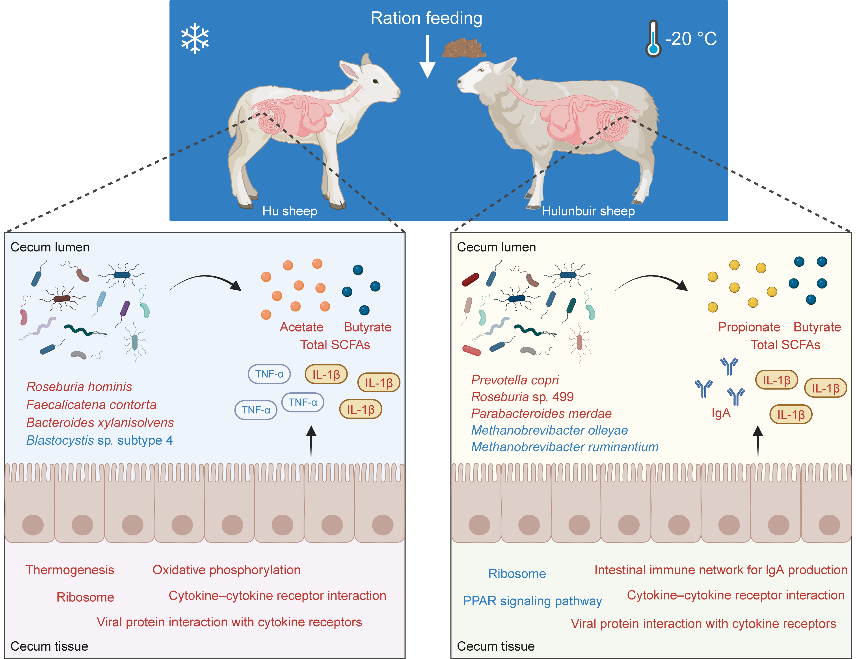 近期,中國科學(xué)院西北生態(tài)環(huán)境資源研究院畜牧團(tuán)隊聯(lián)合山東省農(nóng)業(yè)科學(xué)院、黃三角生物遺傳與分子精準(zhǔn)育種實驗室和黃河口生物精準(zhǔn)營養(yǎng)研發(fā)中心,以呼倫貝爾羊(耐寒型)與湖羊(低溫敏感型)為研究對象,通過構(gòu)建綿羊冷慢性應(yīng)激模型,結(jié)合限飼控制,系統(tǒng)解析了盲腸微生物群落、代謝產(chǎn)物及宿主轉(zhuǎn)錄組的協(xié)同響應(yīng)機(jī)制。