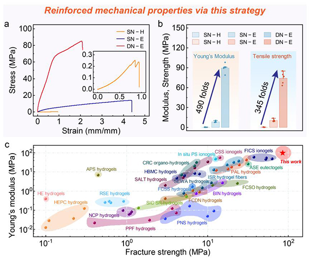 超強凝膠通常模量和強度較高,但力學(xué)韌性一直是挑戰(zhàn)。該研究通過將低共熔溶劑(DES)引入半結(jié)晶性PVA水凝膠中進行機械訓(xùn)練,實現(xiàn)了超高強度與優(yōu)異韌性的兼容(圖1)。在溶劑置換過程中,通過氫鍵重構(gòu)促進PVA結(jié)晶增強,形成密集的納米晶域并賦予超滯后效應(yīng),實現(xiàn)單次預(yù)伸展的“超滯后介導(dǎo)的機械訓(xùn)練”。同時,得益于超滯后的結(jié)構(gòu)阻滯效應(yīng),機械訓(xùn)練后的單網(wǎng)絡(luò)凝膠還可進一步浸泡前驅(qū)液,并通過自由基聚合構(gòu)建化學(xué)交聯(lián)的第二網(wǎng)絡(luò)形成層級互穿。此層級互穿的雙網(wǎng)絡(luò)結(jié)構(gòu)賦予凝膠材料微觀協(xié)同介觀的多尺度能量耗散特性,極大地提升了力學(xué)性能,其斷裂強度達~ 85.2 MPa、楊氏模量為~ 98 MPa、斷裂韌性提升至~ 130.6 MJ·m?3,遠優(yōu)于目前報道的強韌聚合物凝膠體系(圖2)。