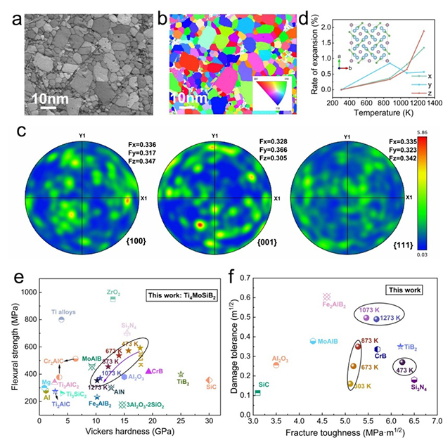 近日,中國科學(xué)院蘭州化學(xué)物理研究所蘭州潤滑材料與技術(shù)創(chuàng)新中心基于T2相通過M位合金化構(gòu)筑策略成功合成了具有面外化學(xué)有序的四元層狀過渡金屬硼化物MAB相—Ti4MoSiB2陶瓷(圖1),并系統(tǒng)研究了其在寬溫域內(nèi)的力學(xué)性能和摩擦學(xué)行為,研究人員發(fā)現(xiàn)材料原子尺度上的層狀結(jié)構(gòu)在穿晶斷裂時有效引導(dǎo)裂紋偏轉(zhuǎn),改變裂紋擴展路徑,提高低溫斷裂韌性;由于晶粒沿不同方向熱膨脹差異造成晶界的熱失配,進而改變了斷裂模式,使材料在室溫至1000℃范圍內(nèi)表現(xiàn)出優(yōu)異的綜合力學(xué)性能,同時賦予了較傳統(tǒng)陶瓷優(yōu)異的損傷容限。與DD5高溫合金對摩時在全溫度范圍內(nèi)都具有良好的抗磨性能,尤其在高溫條件下摩擦化學(xué)反應(yīng)生成的具有氧空位TiO2,一定程度上實現(xiàn)減摩效果,并實現(xiàn)了“負磨損”現(xiàn)象。這些發(fā)現(xiàn)不僅豐富了MAB相材料的基礎(chǔ)理論,也為開發(fā)新型高溫結(jié)構(gòu)功能一體化材料提供了重要指導(dǎo)。
