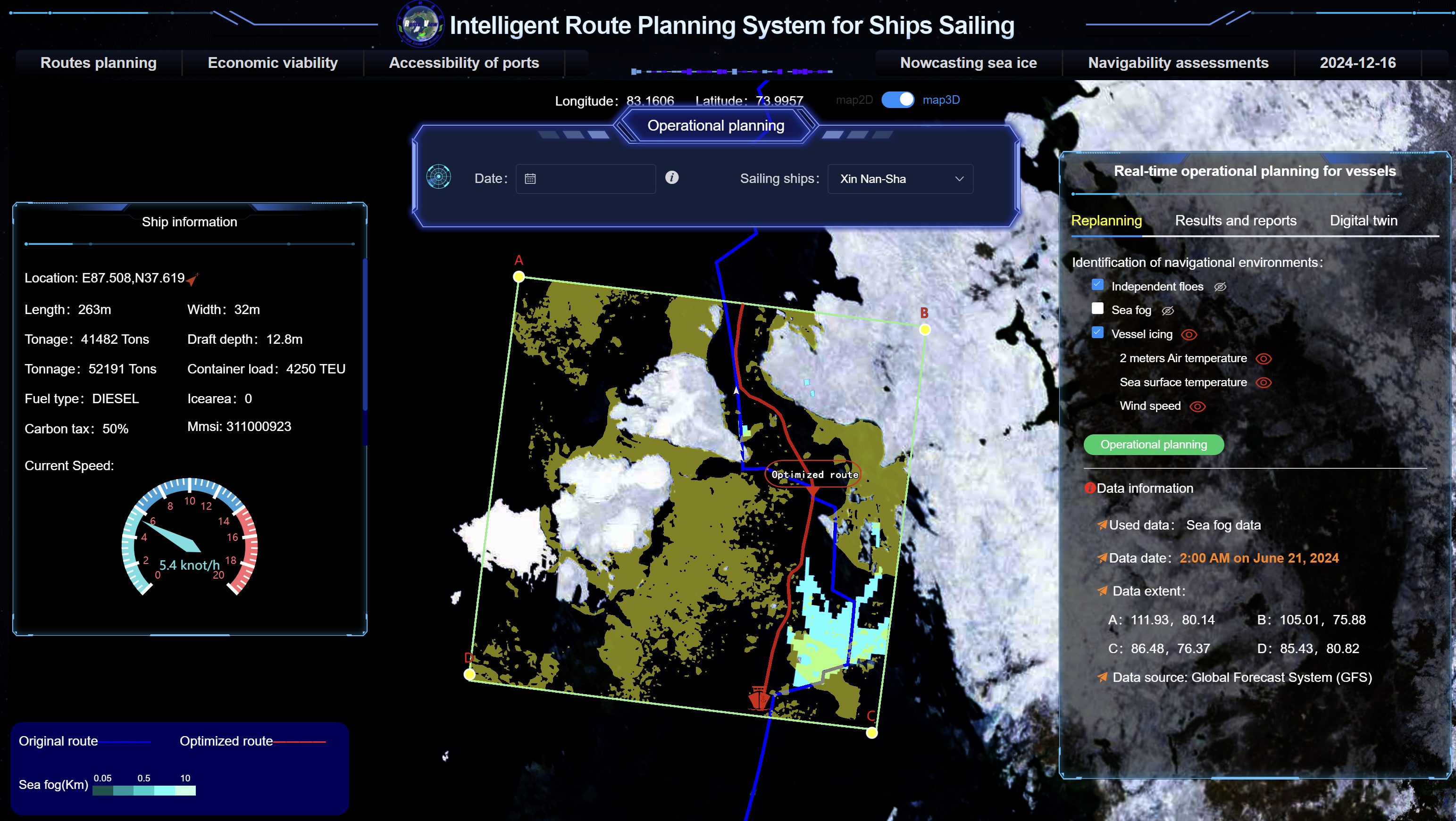 航線實(shí)時(shí)規(guī)劃系統(tǒng)界面(基于實(shí)時(shí)提取的浮冰、海霧及船舶結(jié)冰分布,評(píng)估船舶通航風(fēng)險(xiǎn),實(shí)現(xiàn)船舶航行前方航線的精準(zhǔn)規(guī)劃與優(yōu)化調(diào)整)