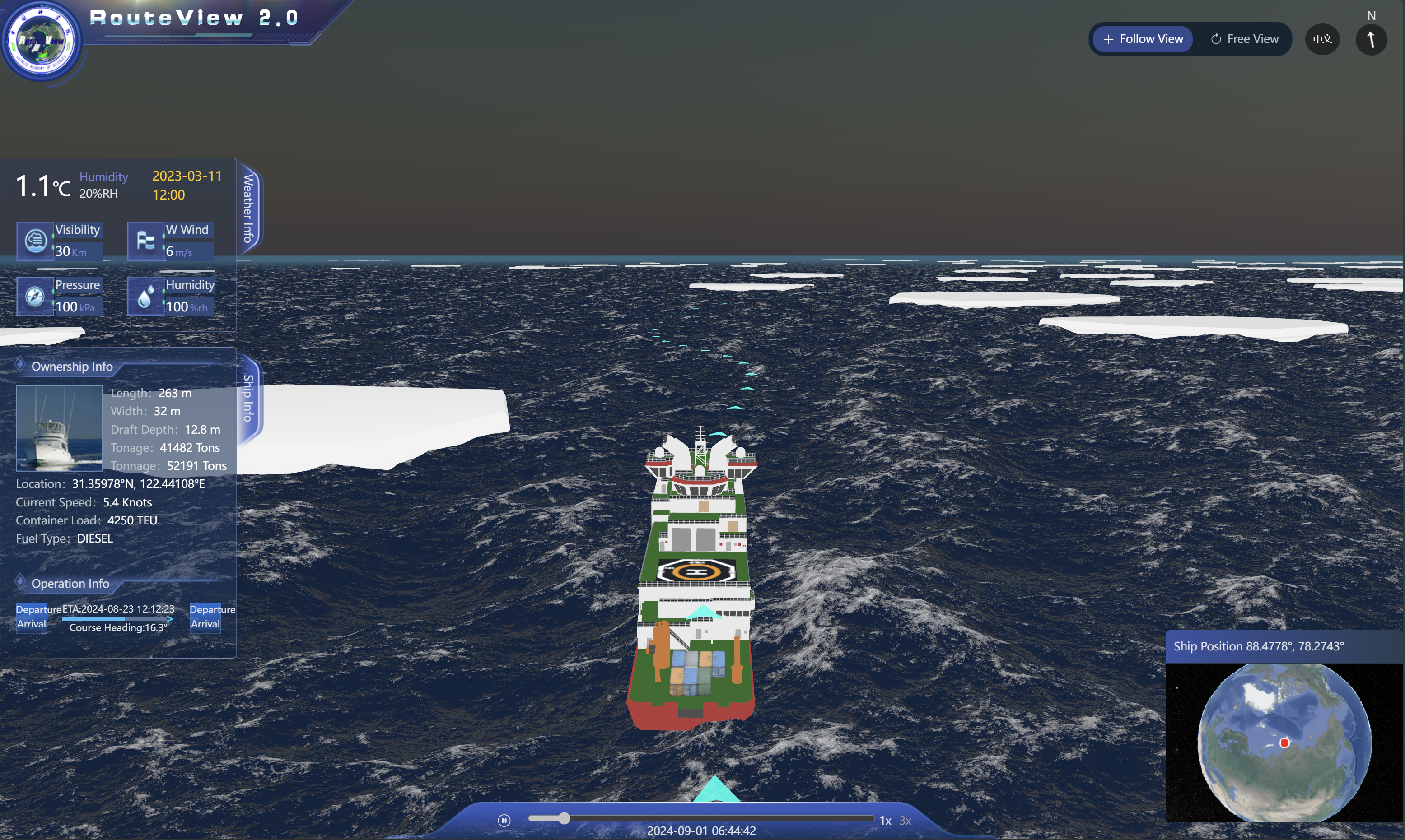 新系統(tǒng)RouteView 2.0從三個(gè)方面提升了極地船舶航行服務(wù)的智能化水平。在船舶航行前方獨(dú)立浮冰實(shí)時(shí)監(jiān)測(cè)方面,該系統(tǒng)突破了傳統(tǒng)千米級(jí)冰情數(shù)據(jù)的粗分辨率限制,構(gòu)建了次公里級(jí)獨(dú)立浮冰在線計(jì)算框架,實(shí)現(xiàn)了東北航道浮冰分布的實(shí)時(shí)動(dòng)態(tài)解析,顯著提升了浮冰信息提取的時(shí)效性與靈活性(250米分辨率)。在船舶航行前方海霧模擬預(yù)警體系方面,該系統(tǒng)基于Polar WRF數(shù)值模型,實(shí)現(xiàn)了對(duì)船舶航行前方海霧的精準(zhǔn)反演(6小時(shí)間隔、5千米分辨率),為低能見度航行提供了實(shí)時(shí)預(yù)警支持。在數(shù)字孿生驅(qū)動(dòng)的智能決策方面,該系統(tǒng)構(gòu)建了北極航道船舶及航行環(huán)境的三維實(shí)景模型,實(shí)時(shí)接入浮冰、海霧等模型計(jì)算數(shù)據(jù),實(shí)現(xiàn)了東北航道局部海域船舶航行的沉浸式展示,形成一種新的航線規(guī)劃可視化手段。