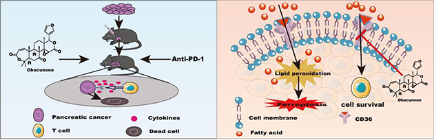 胰腺癌是一種惡性程度極高的消化系統(tǒng)腫瘤,五年生存率不足10%,目前缺乏有效的臨床治療措施,嚴(yán)重影響人類生命健康。近期,研究團(tuán)隊(duì)發(fā)現(xiàn)黃柏酮能顯著增強(qiáng)抗PD-1免疫療法治療胰腺癌的效果,增加腫瘤組織中免疫標(biāo)志物CD4+和CD8+T細(xì)胞的浸潤(rùn)而抑制腫瘤生長(zhǎng),蛋白質(zhì)組學(xué)分析發(fā)現(xiàn)黃柏酮主要通過(guò)調(diào)控CD36介導(dǎo)的PPAR信號(hào)通路,抑制胰腺癌PANC-1細(xì)胞CD36表達(dá),增加CD8+ T細(xì)胞數(shù)量,促進(jìn)胰腺癌細(xì)胞凋亡,從而抑制胰腺癌細(xì)胞生長(zhǎng)。相關(guān)研究成果發(fā)表在European Journal of Pharmacology(994 (2025) 177367)上。