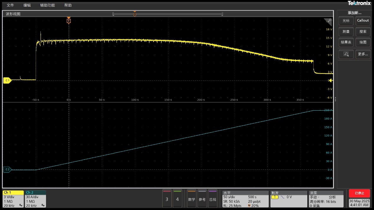 圖2 :額定電流210A勵(lì)磁時(shí)電流和電壓曲線