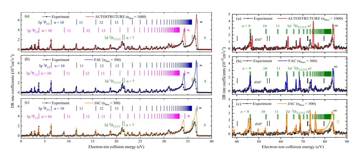 基于蘭州重離子加速器冷卻儲存環(huán)開展的高電荷態(tài)離子的雙電子復合精密譜學實驗具有較高的能量分辨,且其電子-離子相對能量可大范圍精密調(diào)制,是目前唯一能夠精確測量低能碰撞復合截面關鍵數(shù)據(jù)的實驗方法??蒲袌F隊在對M殼層類鈉鐵離子 Fe15+的實驗中,成功測量了 0-90 eV 能量范圍內(nèi)的復合速率系數(shù)。他們將實驗結(jié)果與最新的理論Flexible Atomic Code (FAC) 、AUTOSTRUCTURE、Jena Atomic Calculator (JAC)計算的結(jié)果仔細對比,解析出每個共振結(jié)構的來源。同時,科研人員從雙電子復合速率系數(shù)得到了可用于等離子體建模的等離子體速率系數(shù),并與此前的理論數(shù)據(jù)作了對比研究。