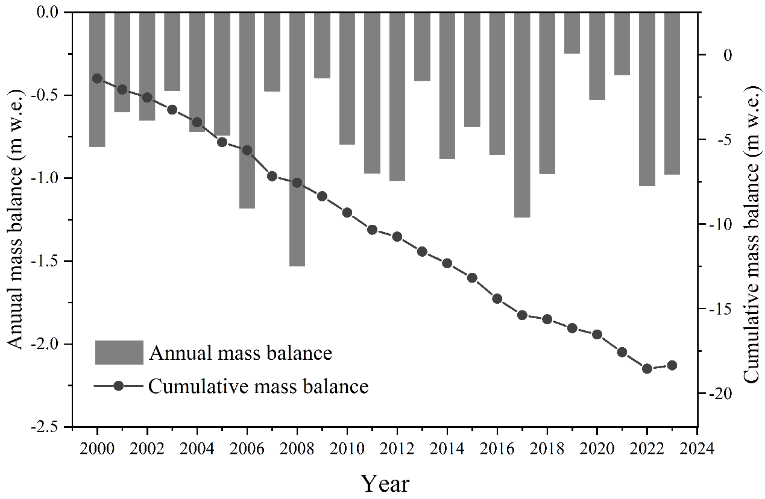 研究團隊選用全分量分布式能量平衡模型(COSIPY),以2015年來逐年物質(zhì)平衡實地觀測數(shù)據(jù)和2000年來每5年間隔大地測量法獲取的物質(zhì)平衡變化作為驗證,模擬重建了2000年至2023年物質(zhì)平衡逐年序列,通過誤差評估和不確定性分析,明確了研究結(jié)果的可靠性。
