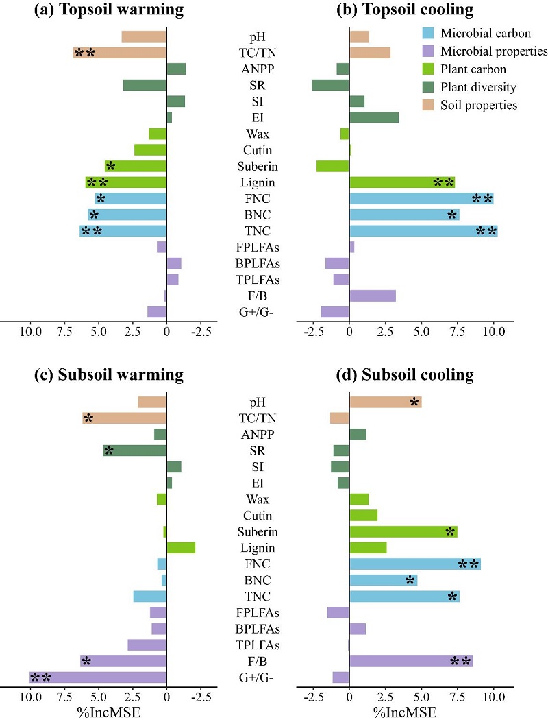研究發(fā)現(xiàn),高寒草甸亞表層土壤有機(jī)碳對增溫、降溫的響應(yīng)較表層更為敏感,無論是增溫還是降溫,均未引起亞表層土壤中植物和微生物源碳組分的顯著變化。然而,增溫使真菌與細(xì)菌生物量比值(F/B)和革蘭氏陽性細(xì)菌與革蘭氏陰性細(xì)菌生物量比值(G+/G-)分別增加15.0%和8.6%,而降溫則使其分別降低4.5%和9.6%。進(jìn)一步分析發(fā)現(xiàn),增溫主要通過增加F/B和G+/G-直接減少土壤有機(jī)碳庫的積累,同時(shí)降低土壤碳氮比間接減少亞表層土壤有機(jī)碳含量,而降溫則主要通過降低F/B增加亞表層土壤有機(jī)碳含量。如果只考慮增溫而不考慮降溫的作用,傳統(tǒng)的增溫控制實(shí)驗(yàn)可能會低估氣候變暖對高寒草地亞表層土壤有機(jī)碳庫的消極作用。該研究為更好地解釋和預(yù)測未來氣候變化背景下高寒草地生態(tài)系統(tǒng)土壤碳庫的形成與變化提供了新的理論依據(jù)。