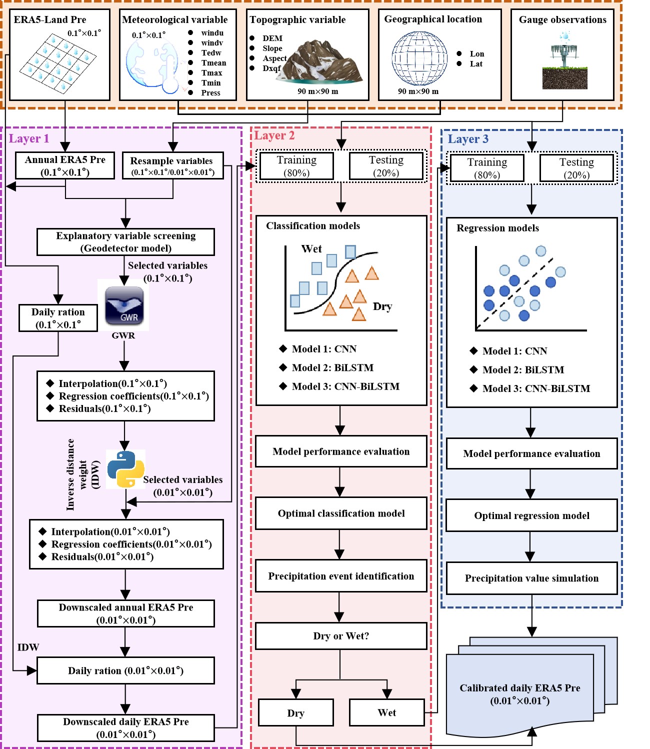 TLIDC技術(shù)框架。TLIDC框架整體分為三部分:降水?dāng)?shù)據(jù)的空間降尺度(表示為L(zhǎng)ayer 1)、降水事件的識(shí)別(表示為L(zhǎng)ayer 2)和降水量的模擬(表示為L(zhǎng)ayer 3)。Layer 1通過(guò)GWR模型,提供高空間分辨率的降水?dāng)?shù)據(jù),Layer 2和Layer 3利用構(gòu)建的CNN-BiLSTM模型來(lái)提高降尺度后降水?dāng)?shù)據(jù)的準(zhǔn)確性