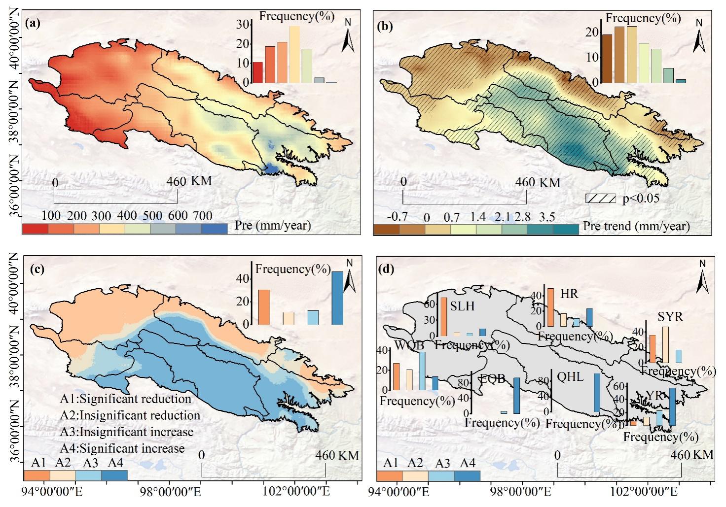 1950-2024年祁連山降水重建結(jié)果及時(shí)空變化特征。(a)重建降水的空間分布;(b) Sen’s趨勢(shì)估計(jì)與Mann-Kendall顯著性檢驗(yàn)結(jié)果;(c)祁連山降水時(shí)空變化的趨勢(shì)類型;(d)各子流域降水時(shí)空變化的趨勢(shì)類型。