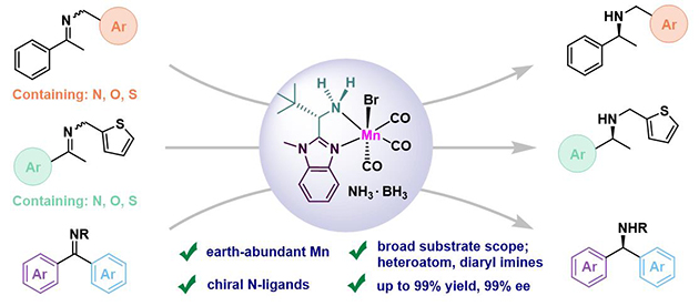 手性胺是重要的有機(jī)合成砌塊,在醫(yī)藥、農(nóng)藥和精細(xì)化學(xué)品中廣泛應(yīng)用,碳氮雙鍵(C=N)的不對稱(轉(zhuǎn)移)氫化是制備手性胺最為高效和快捷的方法之一。傳統(tǒng)的不對稱(轉(zhuǎn)移)氫化方法依賴于貴金屬催化劑和復(fù)雜配體。硫(S)、氮(N)、氧(O)是自然界和藥物化學(xué)中重要的雜原子,然而,由于其孤對電子對金屬催化劑的毒化性質(zhì)使得含硫(S)、氮(N)、氧(O)的亞胺化合物和胺類化合物難以在眾多貴金屬催化體系中兼容。此外,雙芳基亞胺由于其兩側(cè)的芳基具有相似的立體位阻和電子性質(zhì),使得手性催化劑在雙芳基亞胺的不對稱還原中存在極大的選擇性識別挑戰(zhàn)。在“雙碳”目標(biāo)引領(lǐng)下,利用豐產(chǎn)元素代替貴金屬的催化過程是實(shí)現(xiàn)二氧化碳減排、發(fā)展低碳催化新技術(shù)的重要手段之一,在精細(xì)化學(xué)品、制藥領(lǐng)域具有廣泛的應(yīng)用前景。