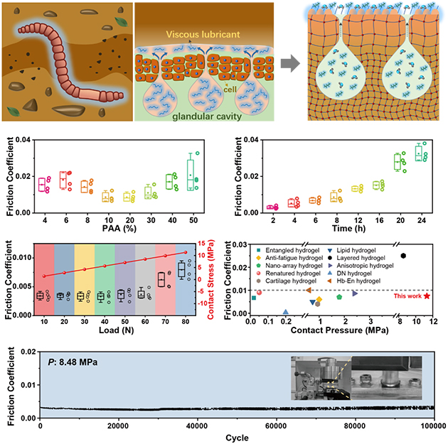 中國科學(xué)院蘭州化學(xué)物理研究所潤滑材料全國重點(diǎn)實(shí)驗(yàn)室周峰研究員和麻拴紅研究員團(tuán)隊(duì),受自然界蚯蚓持續(xù)潤滑機(jī)制啟發(fā),開發(fā)了一種基于微量潤滑劑的聚合物凝膠超潤滑材料。