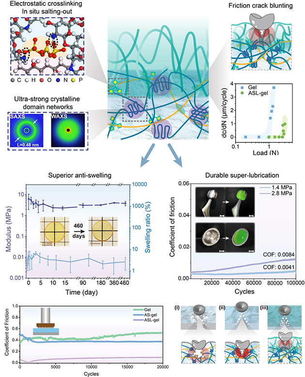 在解決聚合物凝膠材料超高承載和機(jī)械魯棒性超潤滑難點(diǎn)基礎(chǔ)之上,研究人員將關(guān)注點(diǎn)轉(zhuǎn)移到解決材料在苛刻鹽離子介質(zhì)中的長效力學(xué)穩(wěn)定性難題。盡管已報道的大多數(shù)聚合物凝膠材料能夠?qū)崿F(xiàn)優(yōu)異的承載與減摩功能,但其在復(fù)雜離子介質(zhì)中普遍存在溶脹和力學(xué)失效問題,摩擦學(xué)評價往往以去離子水為潤滑介質(zhì),這明顯與聚合物材料的實(shí)際應(yīng)用工況不符(海水或生理介質(zhì)),使得相關(guān)材料的開發(fā)僅僅停留在概念和模型水平。