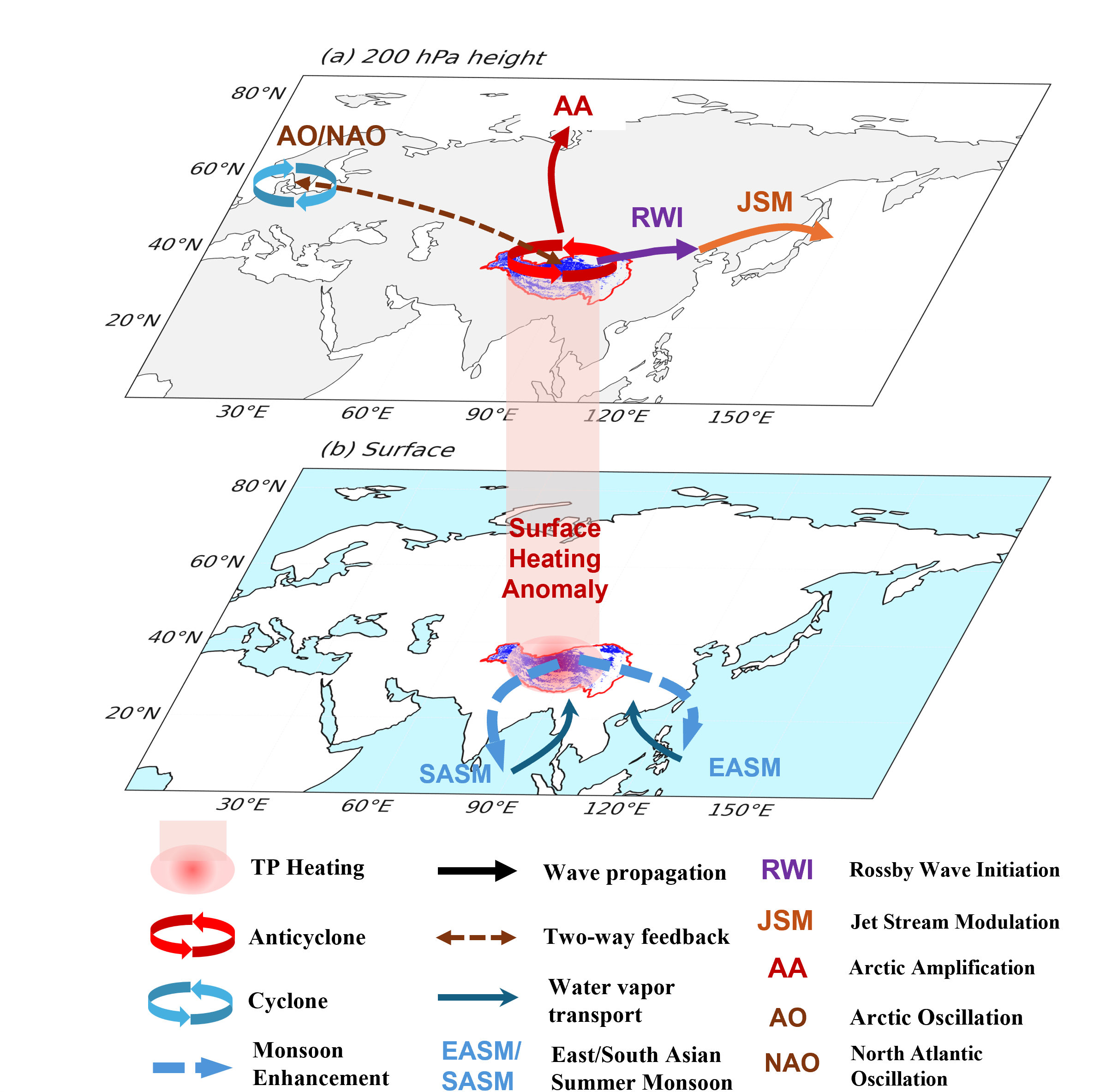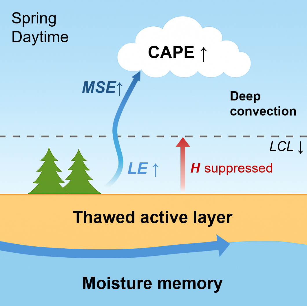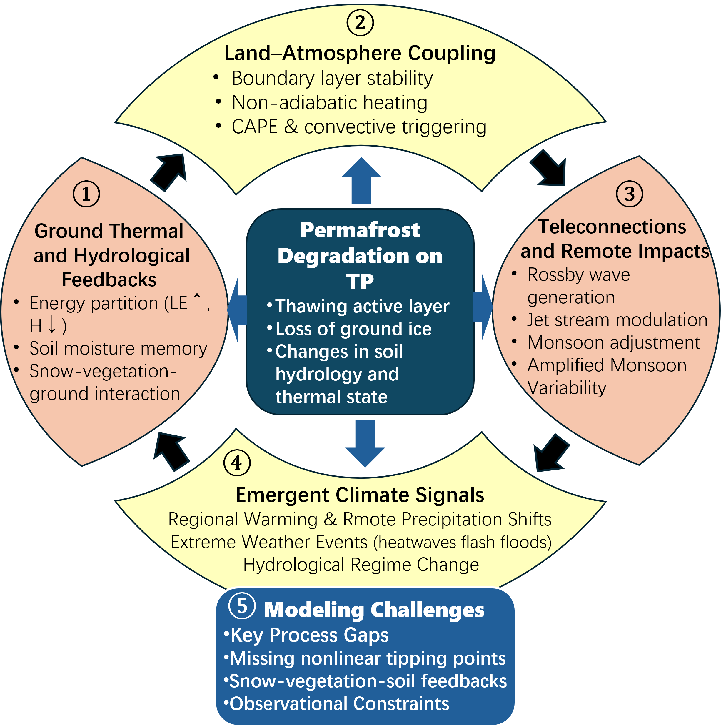 研究團隊依托長期野外觀測、遙感反演和過程模擬,完整描繪了“地表能量分配→邊界層演變→季風與行星波響應”的多尺度反饋鏈條。結果表明,多年凍土的“凍融記憶”,即凍結或融化狀態(tài)在季節(jié)間延續(xù)并影響后續(xù)熱量與水分過程,并對土壤熱物理特性及潛熱/顯熱分配造成影響,共同決定了能量釋放的節(jié)奏與路徑,進而影響邊界層穩(wěn)定性、對流觸發(fā)和大氣遙相關結構。