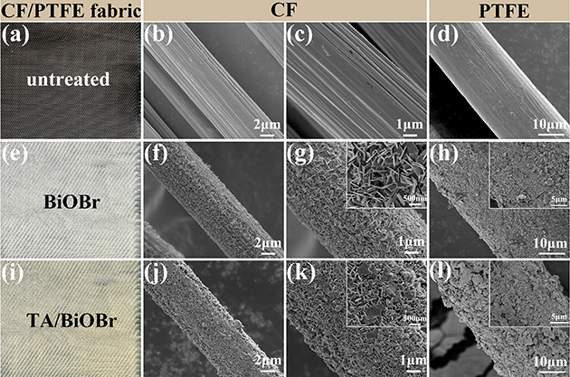 眾所周知,CF和PTFE纖維表面具有強(qiáng)化學(xué)惰性,導(dǎo)致其復(fù)合材料的界面結(jié)合性能差。在上述工作進(jìn)行摩擦學(xué)性能評(píng)價(jià)的過(guò)程中,存在大量纖維與樹脂基體脫黏拔出的現(xiàn)象,對(duì)復(fù)合材料的整體性能的發(fā)揮產(chǎn)生不利影響。近日,研究團(tuán)隊(duì)基于前期研究基礎(chǔ),在界面優(yōu)化改性方面提出了新思路。團(tuán)隊(duì)首次將BiOBr應(yīng)用于摩擦學(xué)領(lǐng)域,并提出了“軟-硬-軟”多級(jí)結(jié)構(gòu)的設(shè)計(jì)思路,通過(guò)化學(xué)浴、水熱生長(zhǎng)和層層自組裝方法在CF/PTFE織物表面依次構(gòu)建了化學(xué)交聯(lián)的“軟”基底層(PEI/PA)、垂直取向的“硬”中間層(BiOBr納米片)以及動(dòng)態(tài)配位的“軟”外層(TA/Fe3+金屬-多酚網(wǎng)絡(luò))。其改性前后的纖維表面形貌如圖1所示。