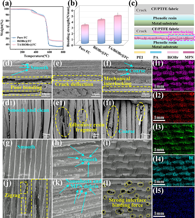 圖3.CF/PTFE纖維織物復(fù)合材料的TGA曲線(a)、粘結(jié)強(qiáng)度(b)和界面增強(qiáng)機(jī)理(c);純FC、BiOBr@FC和TA/BiOBr@FC剝離后織物截面上CF(d-f)和PTFE纖維(d1-f1)的SEM圖像;Pure FC(g-i)和TA/BiOBr@FC(j-l)剝離后金屬基板表面的SEM圖像;l的相應(yīng)元素映射(l1-l6)