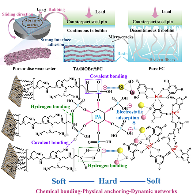 團(tuán)隊(duì)人員在此基礎(chǔ)上提出了在纖維織物表面構(gòu)建“軟-硬-軟”結(jié)構(gòu)增強(qiáng)復(fù)合材料的摩擦學(xué)性能的磨損機(jī)理。未經(jīng)改性的復(fù)合材料在受到外部擠壓和剪切力的作用下,出現(xiàn)大量的微裂紋并伴隨纖維嚴(yán)重拔出斷裂,隨后在對(duì)偶表面形成不均勻不連續(xù)的摩擦膜。而TA/BiOBr@FC經(jīng)由表界面改性,織物界面從微觀到宏觀形成了化學(xué)鍵合-物理錨定-動(dòng)態(tài)網(wǎng)絡(luò)的多級(jí)增強(qiáng)體系,避免纖維-樹脂界面脫黏和纖維拔出,顯著提升了CF/PTFE纖維織物復(fù)合材料的界面性能和摩擦學(xué)性能。
