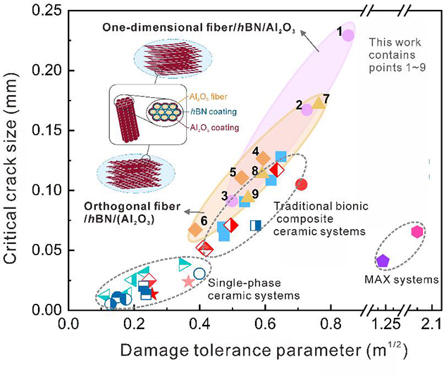 近期,研究人員源于竹木的多取向梯度分布結(jié)構(gòu)啟示,對陶瓷材料進行仿生多尺度結(jié)構(gòu)設(shè)計和多層級優(yōu)化,創(chuàng)造性構(gòu)造出“強-弱-強”的纖維雙界面結(jié)合的梯度多級結(jié)構(gòu)體系。這一創(chuàng)新性設(shè)計為陶瓷材料引入了從微觀到宏觀的跨尺度的裂紋交互行為和外部增韌機制,實現(xiàn)了高強高韌和優(yōu)異損傷容限的獨特結(jié)合。發(fā)展的新型強韌耐損傷仿生復(fù)合陶瓷裂紋擴展韌性達26 MPa·m1/2,比相應(yīng)的裂紋引發(fā)韌性提高了247%,較純氧化鋁提升485%。同時,復(fù)合陶瓷具有極高的理論臨界裂紋尺寸(0.229 mm)和損傷容限參數(shù)(0.852 mm1/2),分別比純氧化鋁提升780%和200%,刷新了仿生復(fù)合陶瓷耐損傷性能的記錄。上述工作還揭示了材料多層級結(jié)構(gòu)與材料裂紋分階段分布擴展之間的關(guān)聯(lián)及其作用機制。