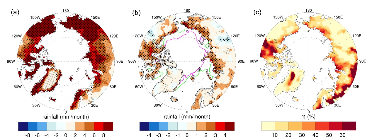 全強迫(a)和僅海冰消融強迫(b)下的北極陸地夏季降雨量的多模式平均響應(yīng),(c)海冰消融對降雨變化的貢獻率