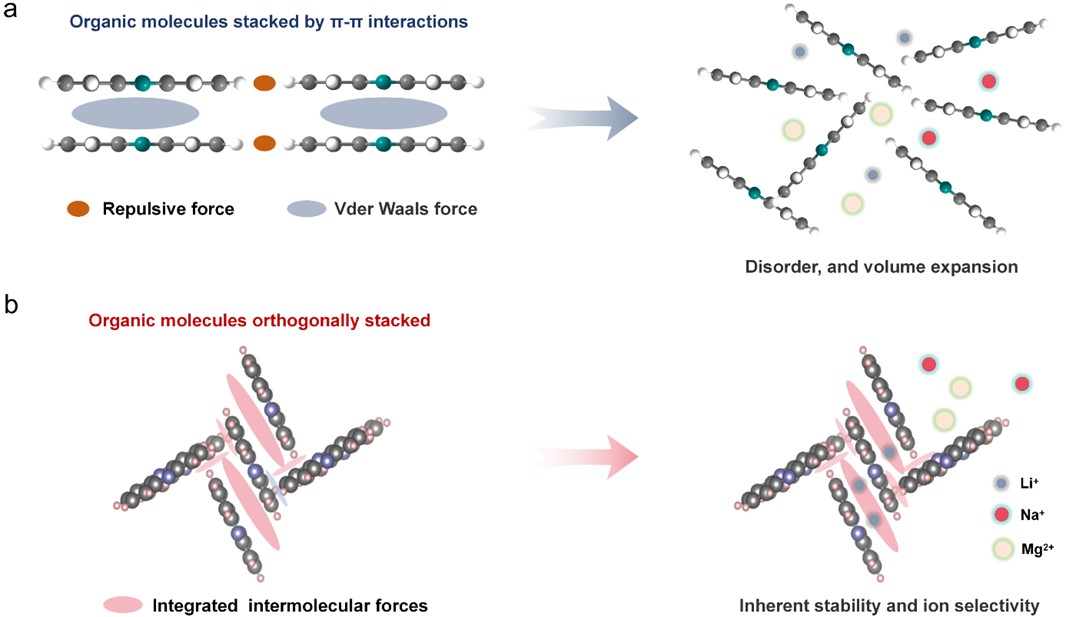 針對高容量有機小分子電極因離子插層體積膨脹導(dǎo)致結(jié)構(gòu)坍塌失穩(wěn)的科學(xué)挑戰(zhàn),研究團隊開創(chuàng)性地提出基于分子間作用力網(wǎng)絡(luò)構(gòu)筑穩(wěn)定晶體結(jié)構(gòu)的新思路。以吩嗪為模型體系,研究證實正交垂直的分子堆疊方式可形成強分子間作用力網(wǎng)絡(luò)和具有離子選擇性的納米孔道。該結(jié)構(gòu)不僅能有效抑制體積膨脹帶來的機械失效問題,同時其產(chǎn)生的親鋰孔道在原子尺度對單價金屬離子(Li)具有優(yōu)先傳輸與選擇性性能,選擇性提鋰容量高達109 mg/g。該工作原創(chuàng)性地揭示了分子堆疊微結(jié)構(gòu)與電極材料的宏觀電化學(xué)穩(wěn)定性和離子選擇性之間的內(nèi)在物理化學(xué)規(guī)律,為設(shè)計新一代兼具高穩(wěn)定性、高選擇性、高通量的有機電化學(xué)離子捕獲材料奠定了重要理論基礎(chǔ)。