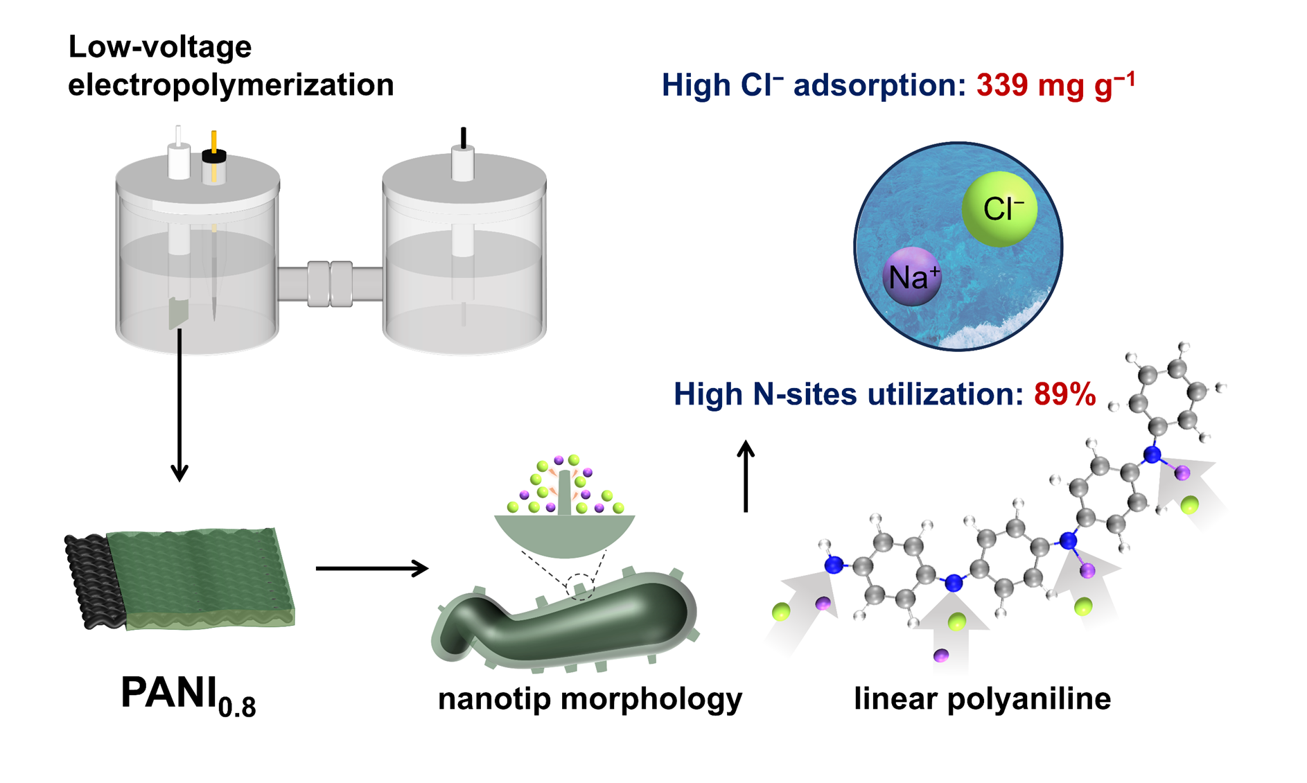 在鹵水資源電化學(xué)提取過程中,需兼顧電中性原則,因此高效提取伴生陰離子同樣重要。聚苯胺(PANI)憑借優(yōu)異的導(dǎo)電性和可逆摻雜特性,廣泛應(yīng)用于能源存儲、環(huán)境凈化和離子分離等領(lǐng)域。然而,傳統(tǒng)PANI因氮活性位點利用率低、微宏觀構(gòu)效關(guān)系不明確等問題,限制了其在高性能電化學(xué)脫鹽中的應(yīng)用。研究團隊創(chuàng)造性發(fā)現(xiàn)聚合電位是調(diào)控其微觀結(jié)構(gòu)(如聚合度、鏈結(jié)構(gòu)、缺陷類型)的關(guān)鍵參數(shù)。通過原位電化學(xué)光譜等手段論證,采用“低電位”策略可有效抑制偶聯(lián)副反應(yīng),制備出含納米尖端的低聚度線性結(jié)構(gòu)聚苯胺。該獨特結(jié)構(gòu)顯著提升了含氮位點的暴露效率和可接近性:實現(xiàn)突破性高容量氯離子吸附(Cl容量達339 mg/g)和鈉離子吸附(142 mg/g)。該工作顯著推動了結(jié)構(gòu)可控聚合物的設(shè)計及其在電化學(xué)分離中的應(yīng)用。