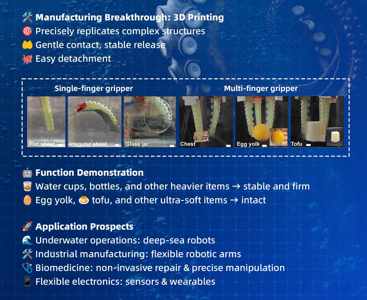 這款仿生吸盤可以裝在機械臂上,穩(wěn)穩(wěn)夾起豆腐、蛋黃等超軟物體而不損傷。它的應用前景廣泛:在深海探測中抓取脆弱生物樣本,在醫(yī)療領域用于非侵入性貼附或手術(shù)輔助,在柔性制造中搬運精密零件。