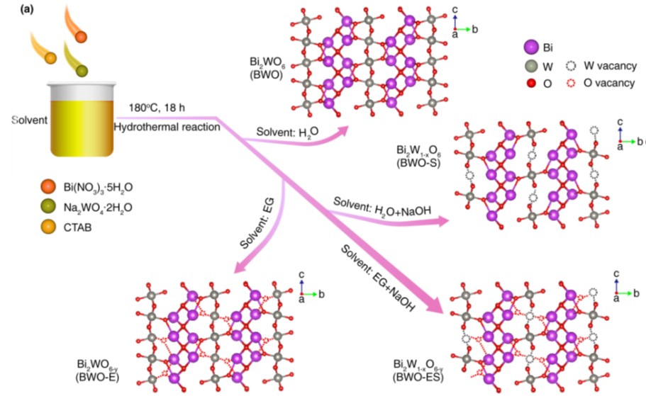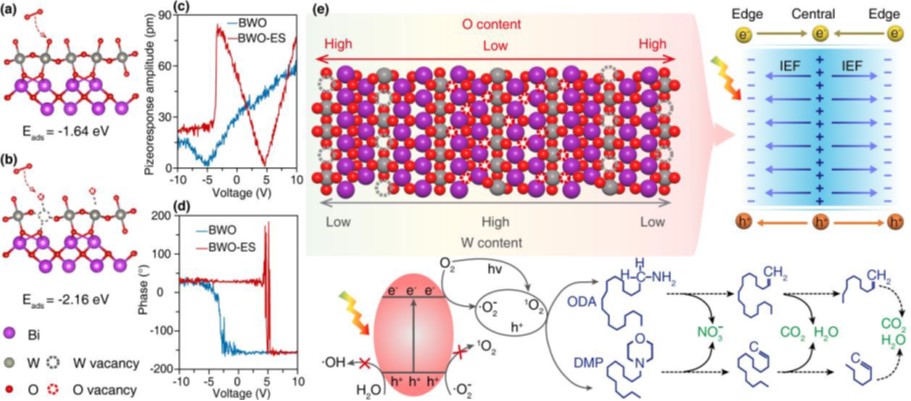中國(guó)科學(xué)院青海鹽湖研究所輕合金與稀散元素分離課題組根據(jù)鉀鹽浮選藥劑性質(zhì)特點(diǎn),聚焦綠色高效處理的研究需要,結(jié)合高原地區(qū)自然光輻照強(qiáng)度大等優(yōu)勢(shì),優(yōu)化光催化材料缺陷工程改性策略,成功制備金屬/非金屬雙缺陷鉍酸鹽光催化材料,考察其對(duì)可見光的吸收利用,并對(duì)雙缺陷結(jié)構(gòu)改性鉍酸鹽光催化劑的催化作用機(jī)制開展深入剖析。研究發(fā)現(xiàn),在水熱制備Bi2WO6過程中加入適當(dāng)比例的還原劑(EG)和刻蝕劑(NaOH),可以實(shí)現(xiàn)“一鍋法”在Bi2WO6納米片的中心和邊緣區(qū)域分別構(gòu)筑O缺陷和W缺陷,強(qiáng)化提升鉍酸鹽的催化性能。機(jī)理研究發(fā)現(xiàn):在雙缺陷結(jié)構(gòu)材料(BWO-ES)中,W缺陷作為負(fù)電荷中心,O缺陷充當(dāng)局部的正電荷中心。當(dāng)這些帶相反電荷的缺陷在晶格不同位置建立時(shí),使Bi2WO6材料的靜電偶極距由本體材料(BWO)的1.54 D提升至BWO-ES的48.15 D,促使材料的內(nèi)建電場(chǎng)強(qiáng)度提升2.74倍,為光生電子-空穴對(duì)的有效分離提供了內(nèi)部驅(qū)動(dòng)力,從而抑制光生載流子的復(fù)合,表現(xiàn)的瞬態(tài)熒光壽命由BWO的1.61 ns提升至BWO-ES的2.63 ns。此外,O缺陷的構(gòu)筑降低了材料的帶隙(2.78 ev→2.54 eV),拓展了材料的光響應(yīng)范圍(446 nm→488 nm)。在可見光(λ≥400 nm)照射下,BWO-ES對(duì)十八胺(ODA)和十二烷基嗎啉(DMP)的降解速率分別達(dá)到13.31 mg/L·h和14.40 mg/L·h,是本體BWO材料降解速率的3.64倍和3.59倍,可實(shí)現(xiàn)鹽溶液中ODA、DMP的完全礦化。