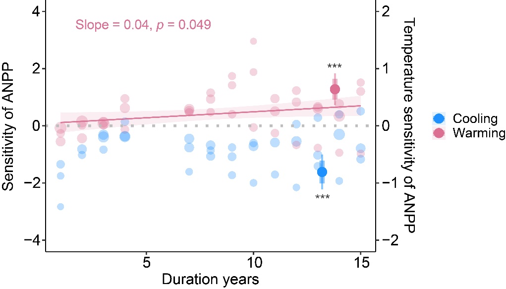 圖2 地上凈初級(jí)生產(chǎn)力對(duì)長(zhǎng)期增溫和降溫的響應(yīng)