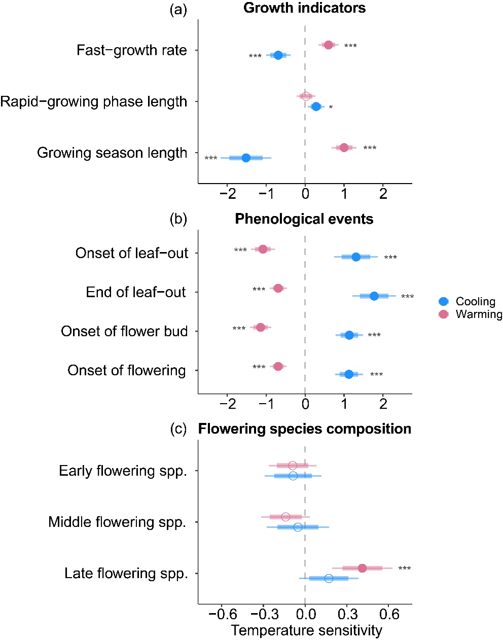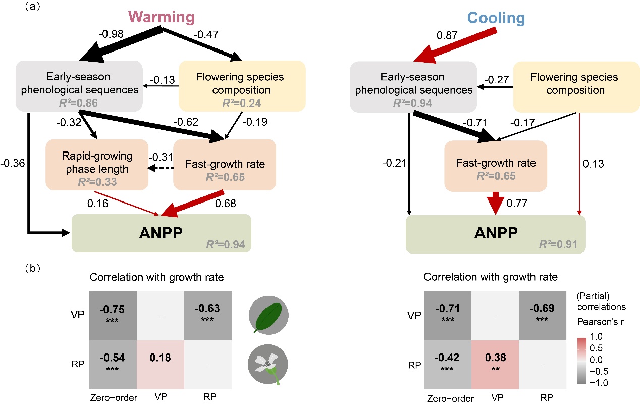 研究結(jié)果表明,在15年增溫處理下,ANPP顯著增加,而在降溫處理下降低。值得注意的是,增溫對(duì)ANPP的促進(jìn)效應(yīng)隨時(shí)間推移逐漸增強(qiáng),而降溫的抑制效應(yīng)則未表現(xiàn)出顯著的時(shí)間依賴性。重要的是,生長(zhǎng)季早期物候影響了ANPP對(duì)增溫和降溫的響應(yīng)。關(guān)鍵發(fā)現(xiàn)在于,生長(zhǎng)季早期的物候變化在調(diào)節(jié)ANPP對(duì)溫度變化的響應(yīng)中發(fā)揮重要作用。具體而言,增溫條件下ANPP的增加與植物返青期提前及生長(zhǎng)速率加快密切相關(guān);而在降溫條件下,葉片與開花物候?qū)χ参锷L(zhǎng)表現(xiàn)出解耦的級(jí)聯(lián)效應(yīng):返青期提前反而抑制了植物后續(xù)生長(zhǎng),而開花期推遲則部分抵消了前期的不利影響。
