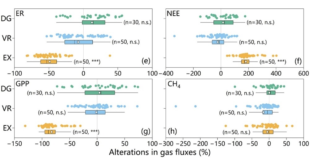 研究表明,熱融滑塌顯著削弱了高寒草地的碳匯功能。與未擾動區(qū)域相比,在植被被剝蝕的裸露地表,生態(tài)系統(tǒng)呼吸降低了49%,而總初級生產(chǎn)力則下降82%,導(dǎo)致凈生態(tài)系統(tǒng)交換增加181%,由碳匯完全轉(zhuǎn)變?yōu)樘荚?。雖然裸露地表表現(xiàn)出持續(xù)的CH4吸收,但其吸收量級遠(yuǎn)不足以抵消額外排放的CO2。
