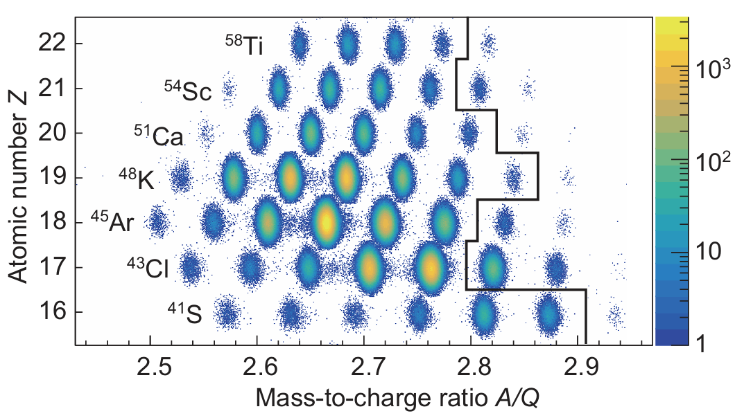 圖1:本次實驗的原子核二維粒子鑒別圖。圖中黑色實線右側(cè)為本工作首次測量半衰期的原子核