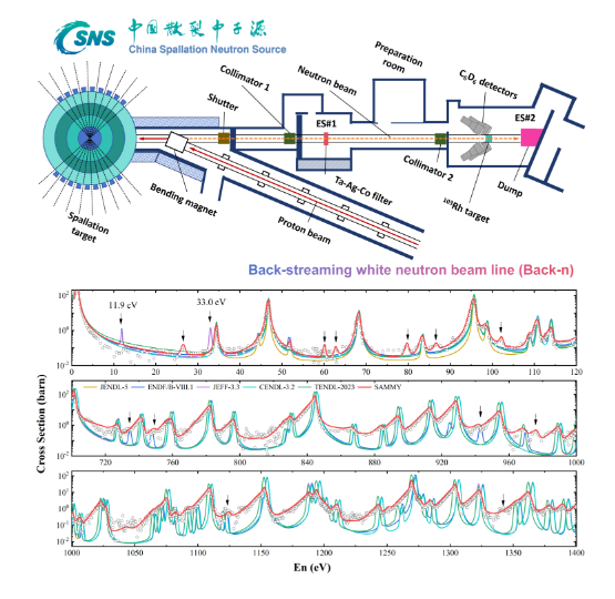 在中子俘獲反應(yīng)研究方面,研究團隊基于中國散裂中子源反角白光中子束線(CSNS Back-n),利用高純度銠-103靶材開展了1eV-1MeV能區(qū)中子俘獲反應(yīng)截面的直接測量。實驗結(jié)果表明,國際主要評價數(shù)據(jù)庫ENDF/B-VIII.1,JEFF-3.3和JENDL-5中11.9 eV和33.0 eV處標(biāo)注的共振能級并不存在。分析認為,上述數(shù)據(jù)庫中的共振峰可能源于早期實驗樣品中鉑族元素鈀(108Pd)與鉑(195Pt)雜質(zhì)的貢獻。此外,基于CSNS Back-n束流的高注量率和優(yōu)異的飛行時間分辨能力,本次實驗首次發(fā)現(xiàn)了銠-103的8個新共振峰,并利用R-矩陣程序SAMMY提取了相應(yīng)的共振參數(shù)。