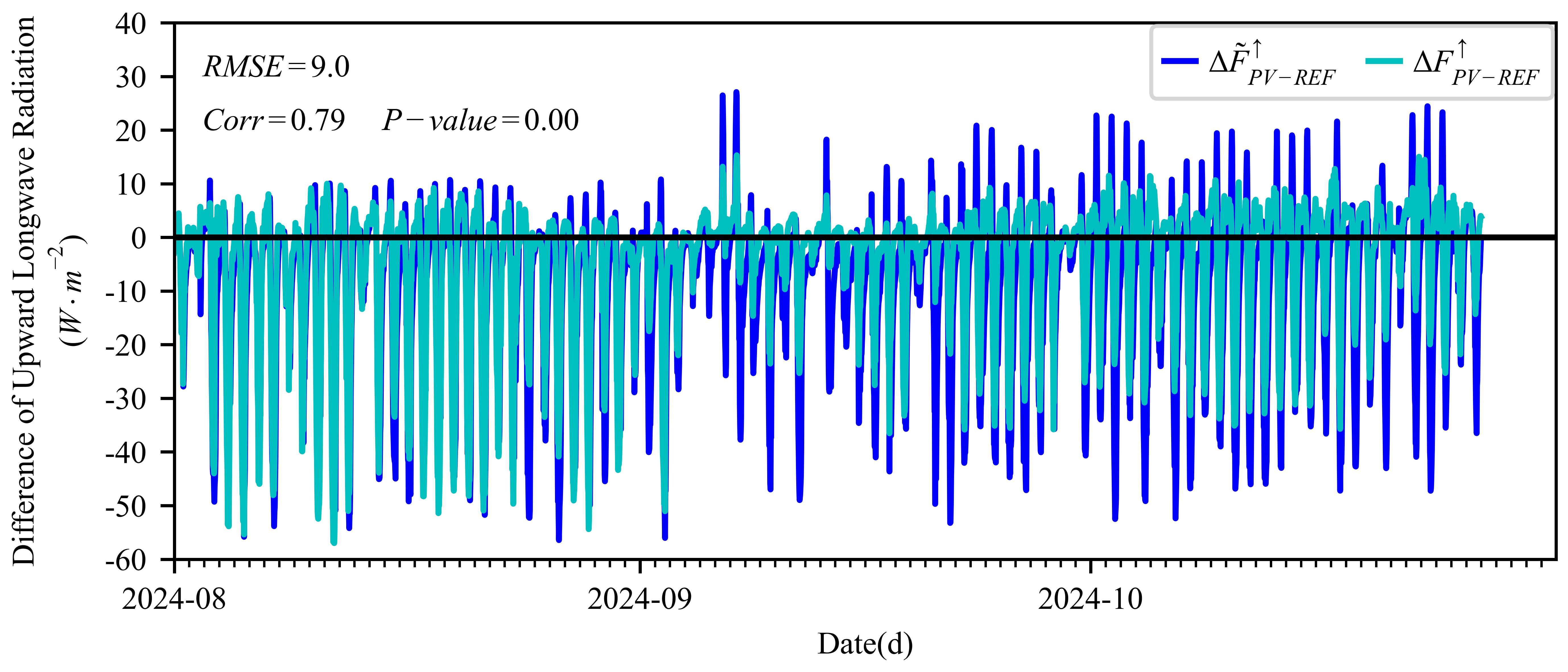 光伏電站內(nèi)外向上長(zhǎng)波輻射通量密度之差的逐日變化:實(shí)測(cè)值(?F_(PV-REF)^↑)和PV3R模型輸出值(?F ?_(PV-REF)^↑)
