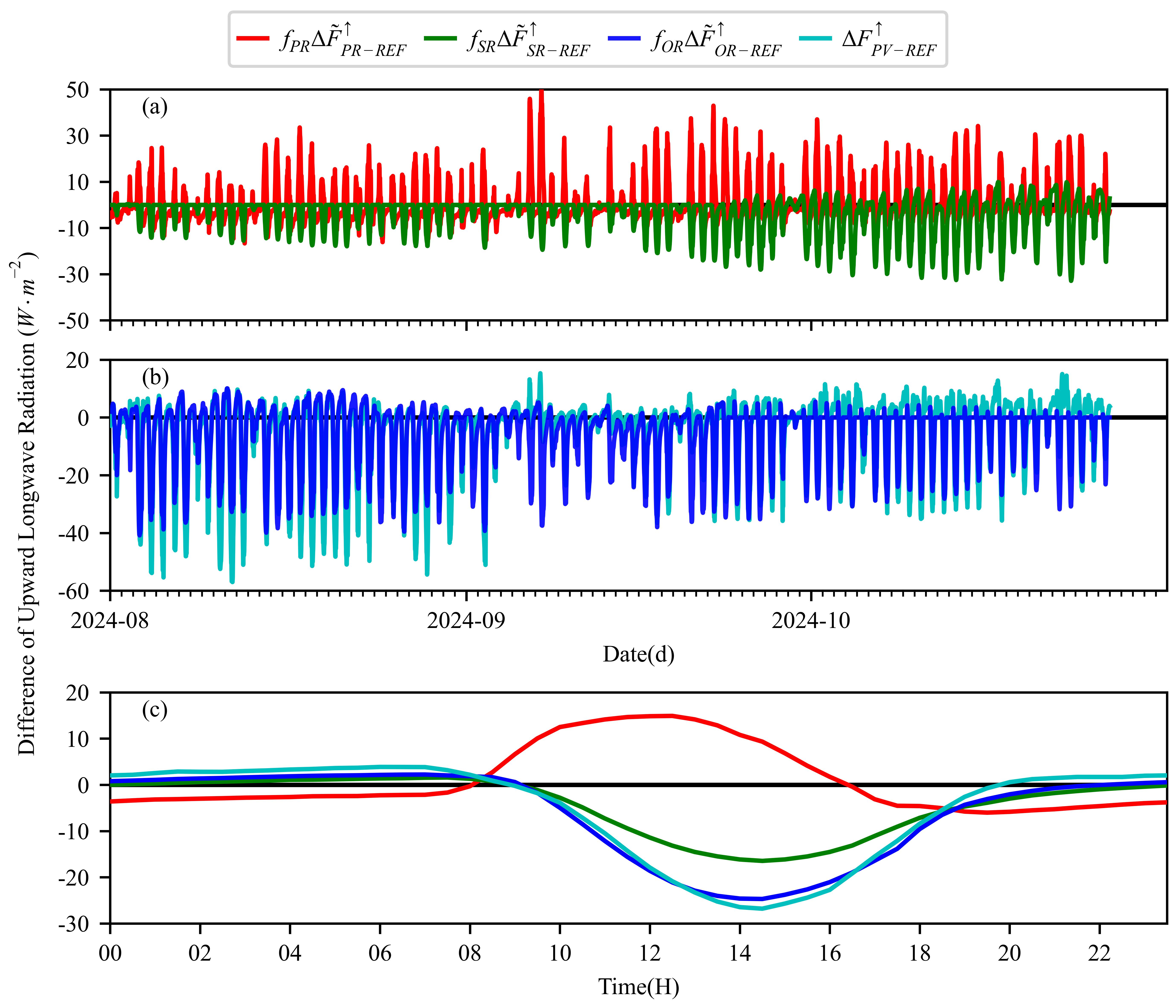 PV3R模型輸出的光伏電站內(nèi)外向上長(zhǎng)波輻射通量密度之差各分量的逐日變化和平均日變化。(a):PV3R模型輸出的光伏陣列區(qū)和參考點(diǎn)向上長(zhǎng)波輻射通量密度之差(f_PR ?F ?_(PR-REF)^↑)以及PV3R模型輸出的遮蔽區(qū)和參考點(diǎn)向上長(zhǎng)波輻射通量密度之差(f_SR ?F ?_(SR-REF)^↑)的逐日變化;(b):PV3R模型輸出的非遮蔽區(qū)和參考點(diǎn)向上長(zhǎng)波輻射通量密度之差(f_OR ?F ?_(OR-REF)^↑)以及觀測(cè)到的光伏電站內(nèi)外向上長(zhǎng)波輻射通量密度之差(?F_(PV-REF)^↑)的逐日變化;(c):f_PR ?F ?_(PR-REF)^↑、f_SR ?F ?_(SR-REF)^↑、f_OR ?F ?_(OR-REF)^↑和?F_(PV-REF)^↑的平均日變化。