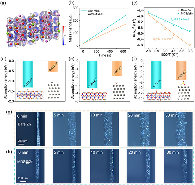 圖3. (a) MDS的靜電勢(shì)(ESP)分布圖。(b) 電化學(xué)石英晶體微天平(EQCM)測(cè)試中,有無(wú)MDS層時(shí)電鍍過程的質(zhì)量變化圖。(c) 基于電荷轉(zhuǎn)移電阻計(jì)算的裸鋅和MDS@Zn陽(yáng)極的活化能。(d)、(e)、(f) 分別為Zn2+、H2O和SO42–在裸鋅和MDS陽(yáng)極(002)晶面上的吸附能圖。(g) 裸鋅陽(yáng)極和 (h) MDS@Zn陽(yáng)極在10mA cm–2電流密度下鋅沉積過程的原位光學(xué)顯微鏡圖像。