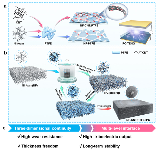 研究人員還研究了無(wú)機(jī)填料引入對(duì)泡沫鎳-聚四氟乙烯互穿相復(fù)合材料性能的增強(qiáng)機(jī)制,結(jié)果表明,碳納米管在三維微米泡沫鎳表面形成納米網(wǎng)狀結(jié)構(gòu),促進(jìn)了界面應(yīng)力傳遞與熱量耗散,顯著提升了力學(xué)強(qiáng)度與導(dǎo)熱性能。得益于泡沫鎳與碳納米管形成的三維微/納網(wǎng)絡(luò),復(fù)合材料輸出電流提高至1.5μA,是純聚四氟乙烯的30倍。摩擦起電響應(yīng)長(zhǎng)效穩(wěn)定,與不同摩擦副具有普適性,展示了互穿相復(fù)合材料具備優(yōu)異導(dǎo)電特性,可作為高效能量收集的摩擦電材料。相關(guān)研究結(jié)果發(fā)表在Small(2025, 21(5):2409607)上。