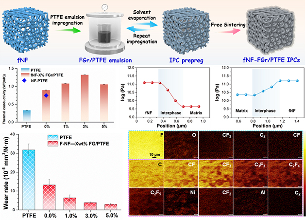 針對(duì)泡沫金屬與聚四氟乙烯異質(zhì)界面結(jié)合弱的問(wèn)題,研究人員采用氟硅烷偶聯(lián)劑對(duì)泡沫鎳三維連續(xù)界面進(jìn)行液相氟化改性,同時(shí)在基體中引入少量氟化石墨。結(jié)果表明,界面-基體“雙氟化”的設(shè)計(jì)有效增強(qiáng)了泡沫鎳與聚四氟乙烯之間的界面結(jié)合,從而抑制外力拉伸時(shí)的變形與裂紋擴(kuò)展;少量氟化石墨的引入增強(qiáng)了PTFE連續(xù)相的硬度、模量,使得雙連續(xù)相復(fù)合材料的導(dǎo)熱系數(shù)提升至1.3 W/(m·K)。得益于由聚四氟乙烯、鎳磨屑與氟化石墨在金屬配副表面形成的復(fù)合摩擦轉(zhuǎn)移膜,進(jìn)一步改善了復(fù)合物的摩擦學(xué)性能,磨損率下降90.7%。相關(guān)研究結(jié)果發(fā)表在Composites Part B: Engineering(2025: 112816)上。