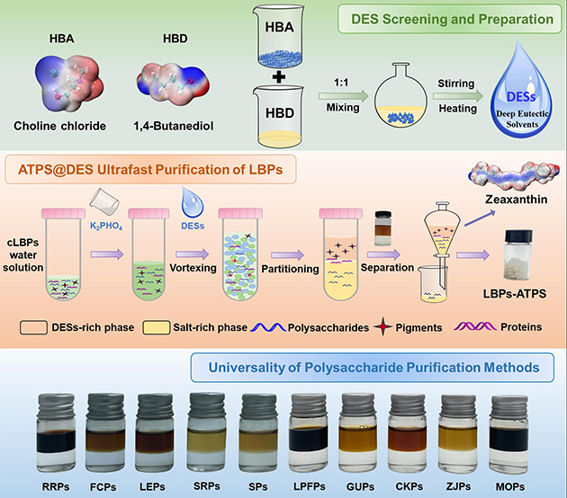 高效、精準(zhǔn)的分離純化是開展多糖精細(xì)結(jié)構(gòu)解析和活性研究的重大難題,而樣品前處理是多糖分離純化的重要基礎(chǔ)和前提。傳統(tǒng)多糖分離純化的樣品前處理技術(shù)包括脫脂、脫蛋白和脫色等過程,不僅操作繁雜、時(shí)間冗長,而且會(huì)導(dǎo)致多糖流失、結(jié)構(gòu)變化和活性失活等。針對(duì)上述問題,課題組提出了將低共熔溶劑(Deep Eutectic Solvents,DES)引入雙水相體系(Aqueous Two-Phase System,ATPS)的新思路,構(gòu)建了新型ATPS@DES多糖樣品前處理新體系,實(shí)現(xiàn)了枸杞多糖同步脫脂、脫蛋白和脫色;同時(shí),在此溫和、綠色的條件下,實(shí)現(xiàn)了枸杞多糖高保留率和最大程度保持多糖的原始結(jié)構(gòu)特征。