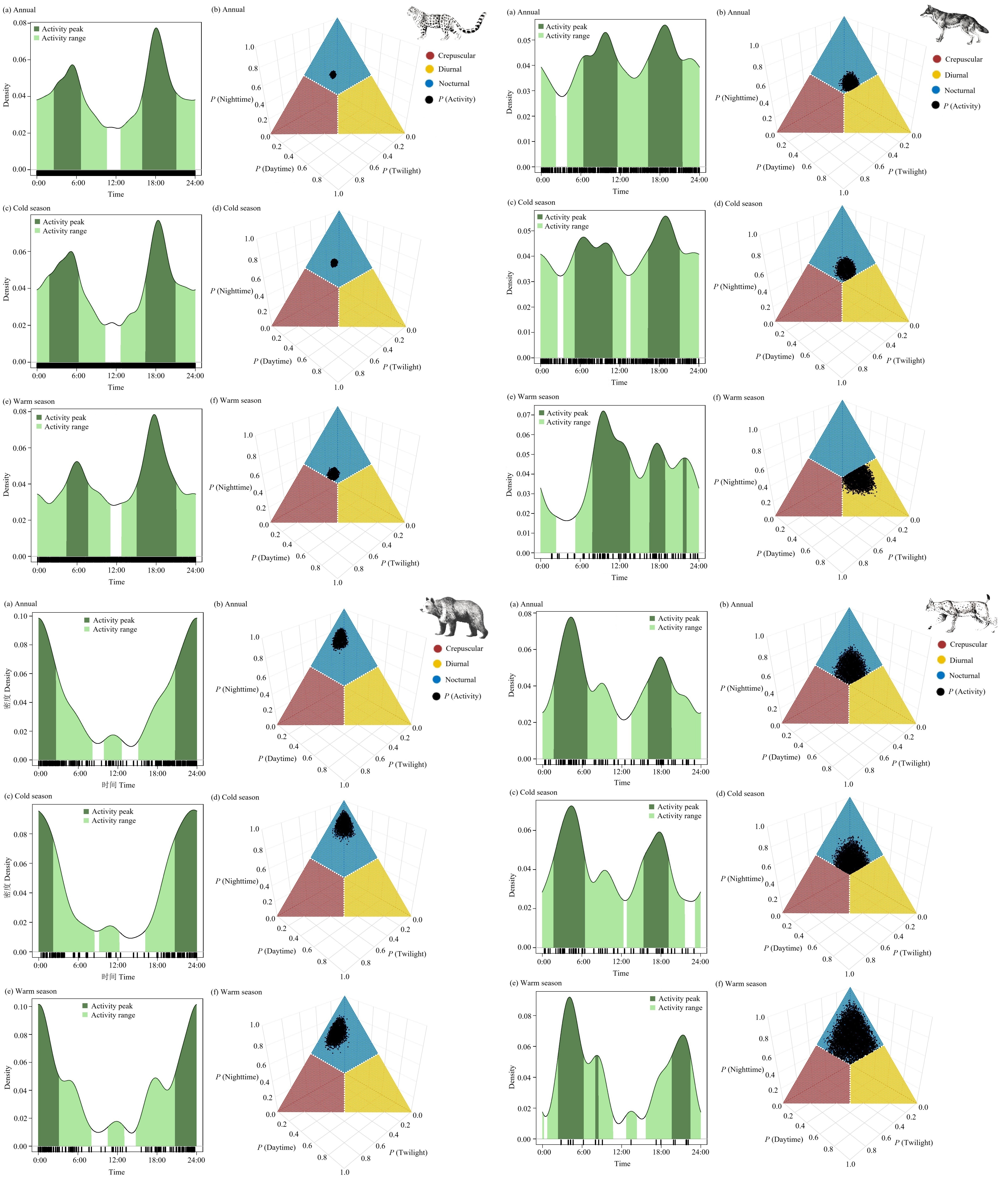 三江源地區(qū)四種大型食肉動物在全年以及冷季和暖季的日活動模式