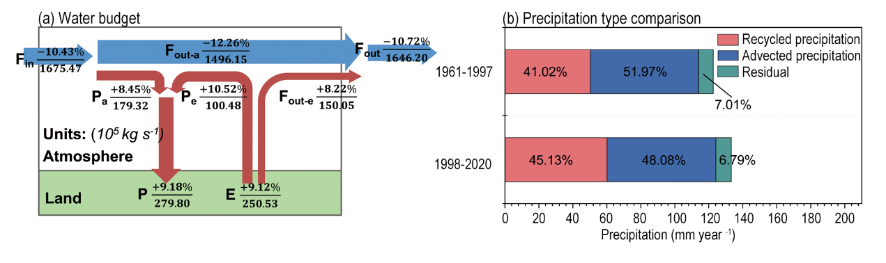 (a)西北干旱區(qū)水分收支圖(圖中數(shù)據(jù)分母為1998–2020年夏季各變量的多年平均值,單位為10? kg/s;分子表示1998–2020年平均值相較于1961–1997年平均值的增加量。其中,F(xiàn)in為水汽流入量,F(xiàn)out為水汽流出量,F(xiàn)out-a和Fout-e分別表示由水平水汽輸送與局地蒸散發(fā)產(chǎn)生的流出水汽;Pa為外部平流水汽形成的降水,Pe為再循環(huán)降水,P為總降水;E為蒸散發(fā));(b)西北干旱區(qū)夏季不同降水類型對比(1961–1997年與1998–2020年平均值;上行:1961–1997年,下行:1998–2020年;紅色:再循環(huán)降水,藍(lán)色:外循環(huán)降水,綠色:殘余項;數(shù)值表示各類型水汽占同期總降水的百分比)。